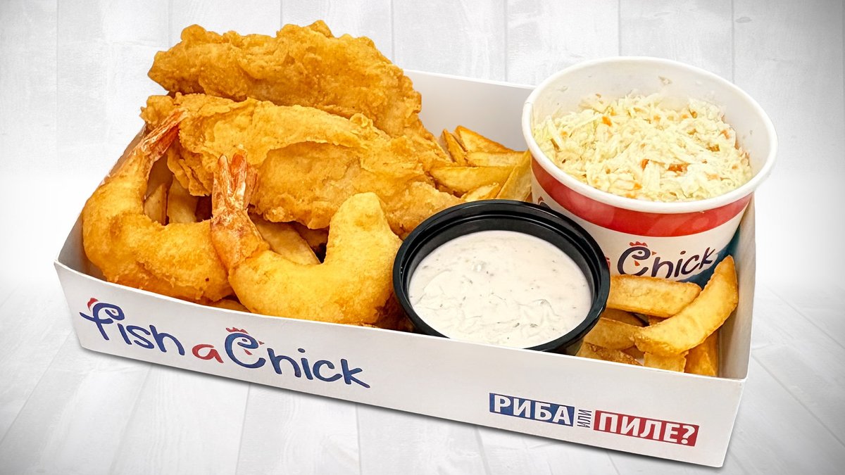Фиш тендърс 2 бр, джъмбо скариди 2 бр, малки картофки, салата косло, сос по избор