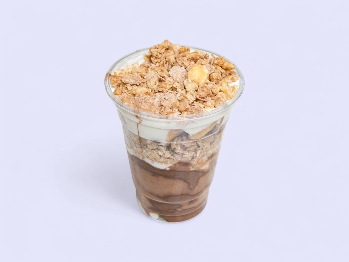 Гранола, кисело мляко, тахан, шоколад, овесени ядки, лешници и банан 380г Имайте предвид, че в ястието има какаови зърна, които може да включват следи от (различни) ядки.