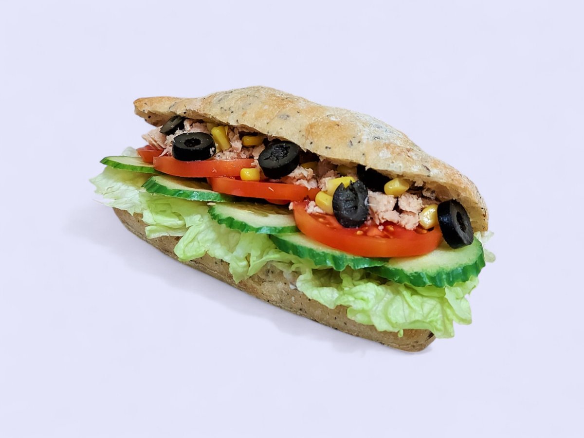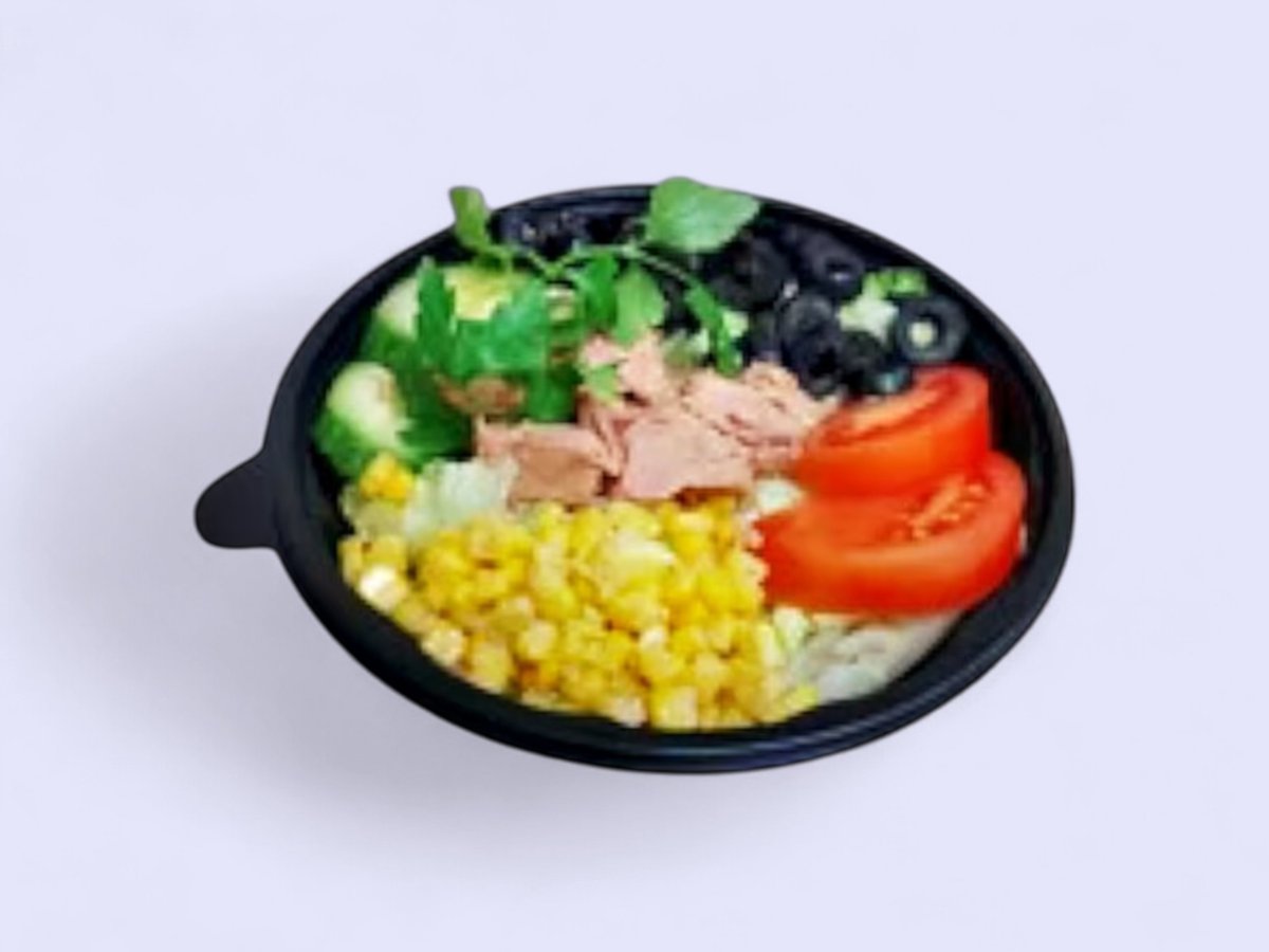Айсберг, риба тон, маслини, царевица, домат, краставица, дресинг