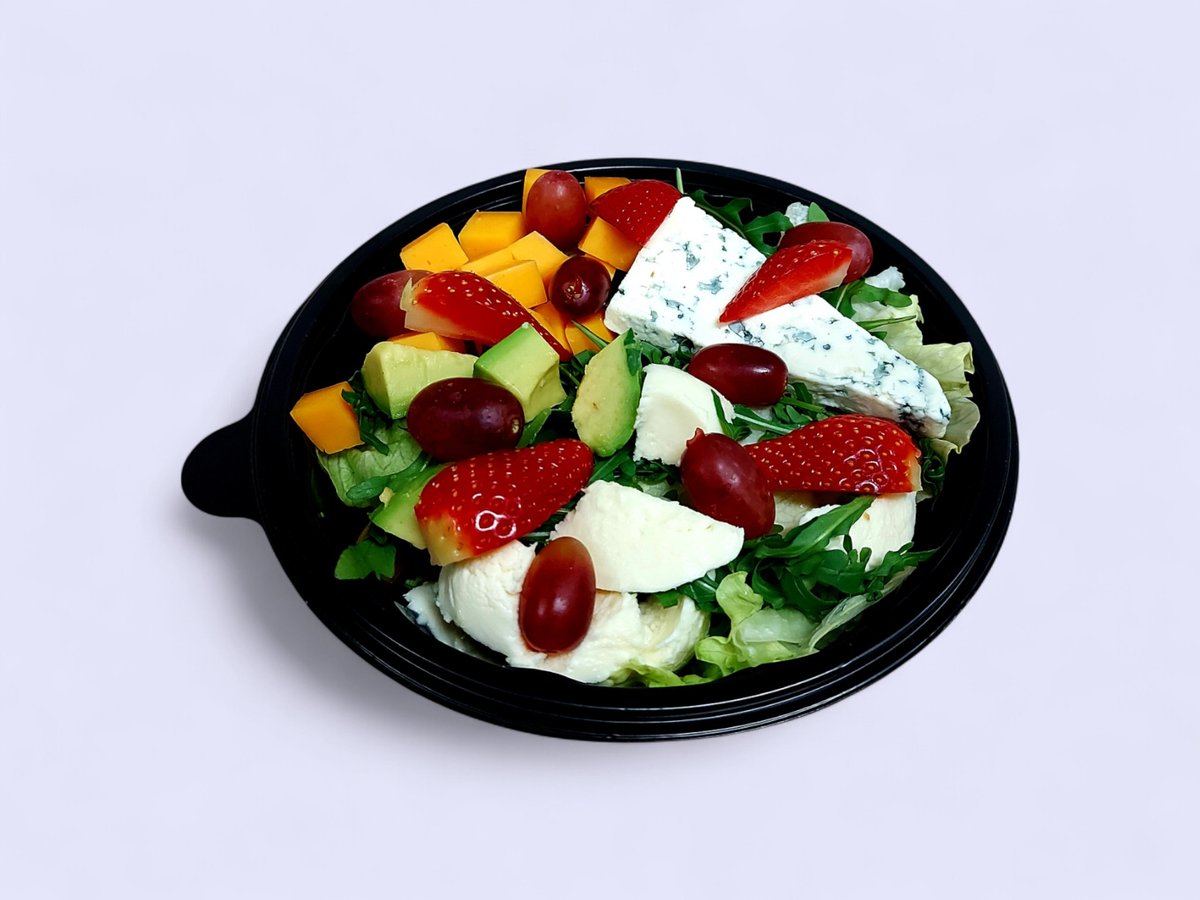 300г Айсберг, микс салати, моцарела, чедър, синьо сирене, сезонен плод, дресинг