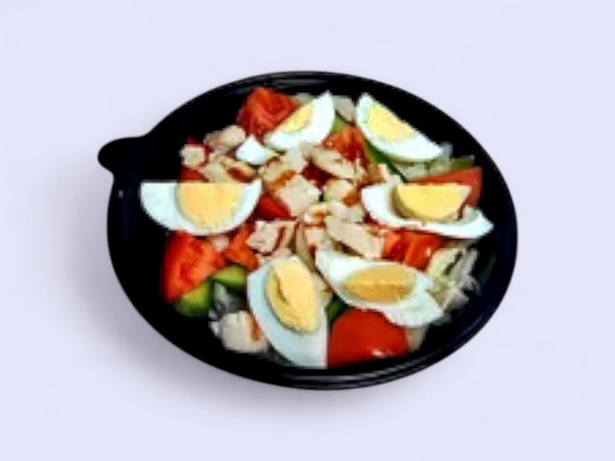 Айсберг, домат, краставица, печено пиле, яйце, дресинг