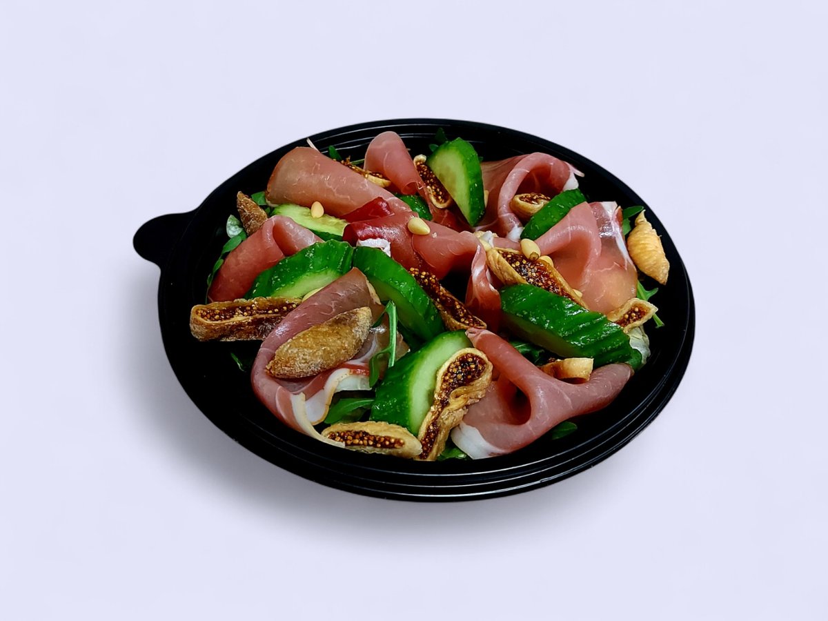 Айсберг, прошуто, микс салати, смокиня, краставица, кедрова ядка, дресинг