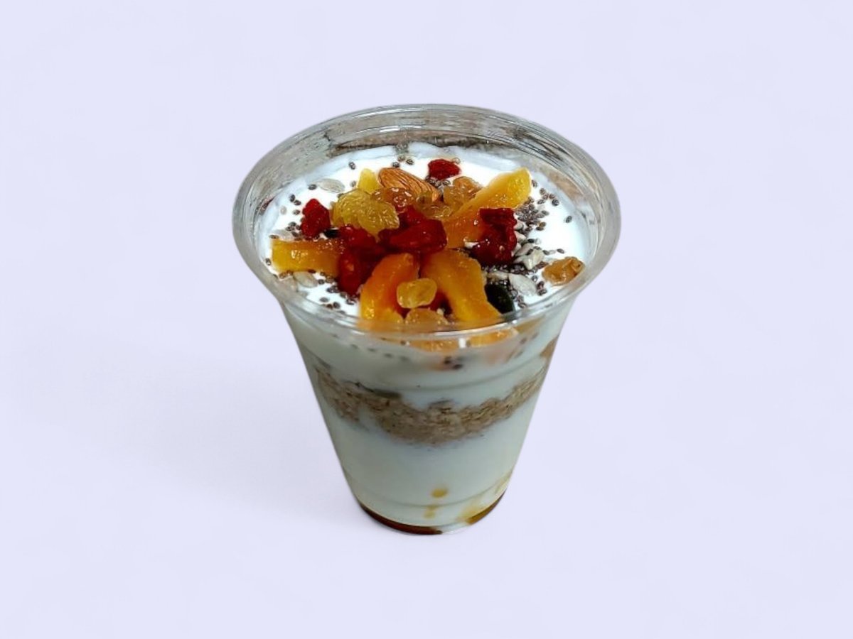 Кисело мляко, овесени ядки, тиквено семе, кайсия, годжи бери, стафиди, мед 350г (без добавена захар)
