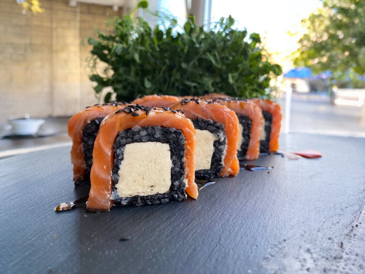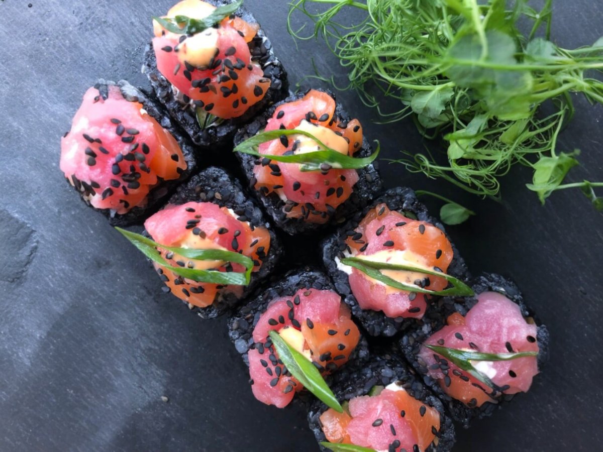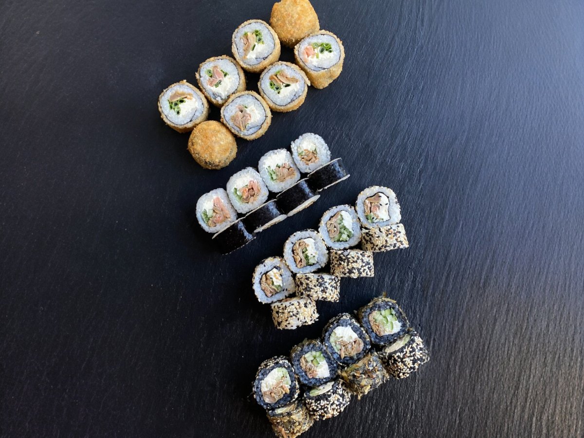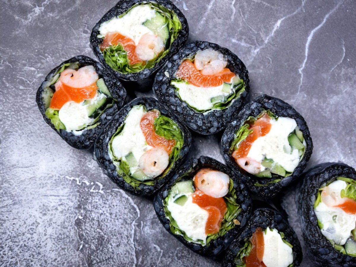 сьомга, черен ориз, крема сирене филаделфия, сусам, риба тон, зелен лук, краставица, нори, сусам, спайси сос, 8бр, 260г