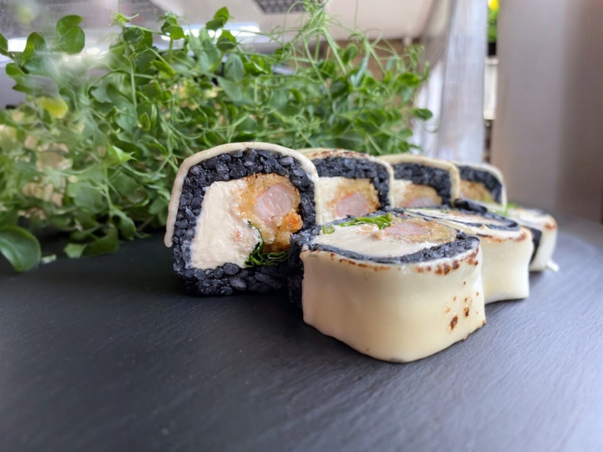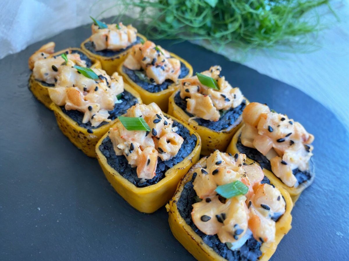 тигрова скарида, черен ориз, крема сирене филаделфия, чедър, краставица, пикантен сос, зелен лук, сусам, нори, 8бр, 280г