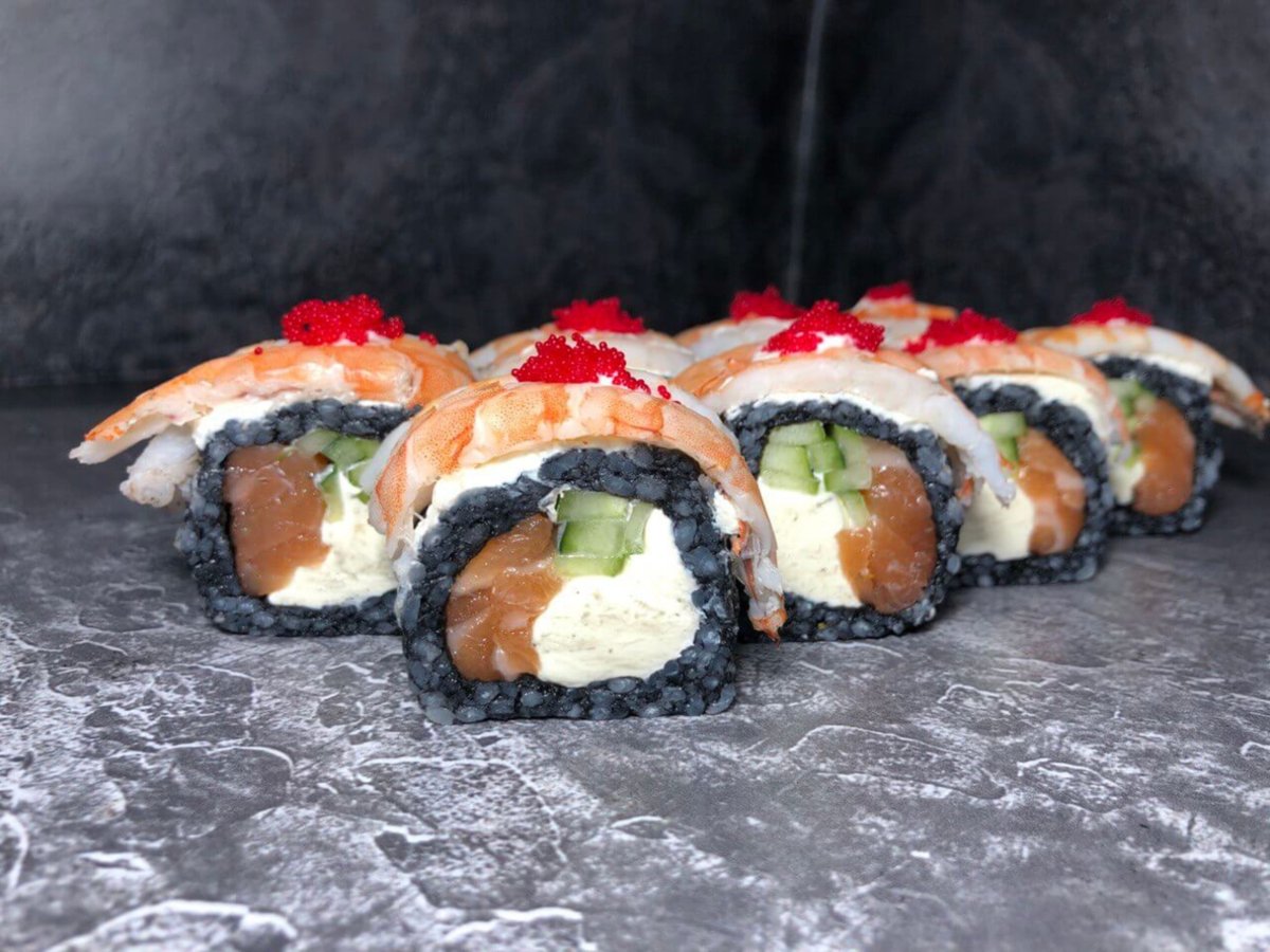 тигрова скарида, черен ориз, крема сирене филаделфия, сьомга, краставица, пикантен сос, чедьр, нори, 8бр, 300г