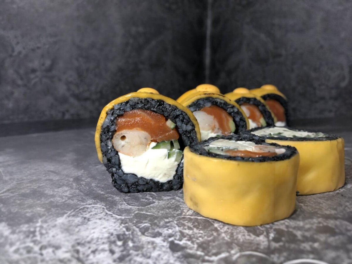 темпура пържена сьомга, футомак пържена сьомга, филаделфия сусам с пържена сьомга, black roll с пържена сьомга, 1000г