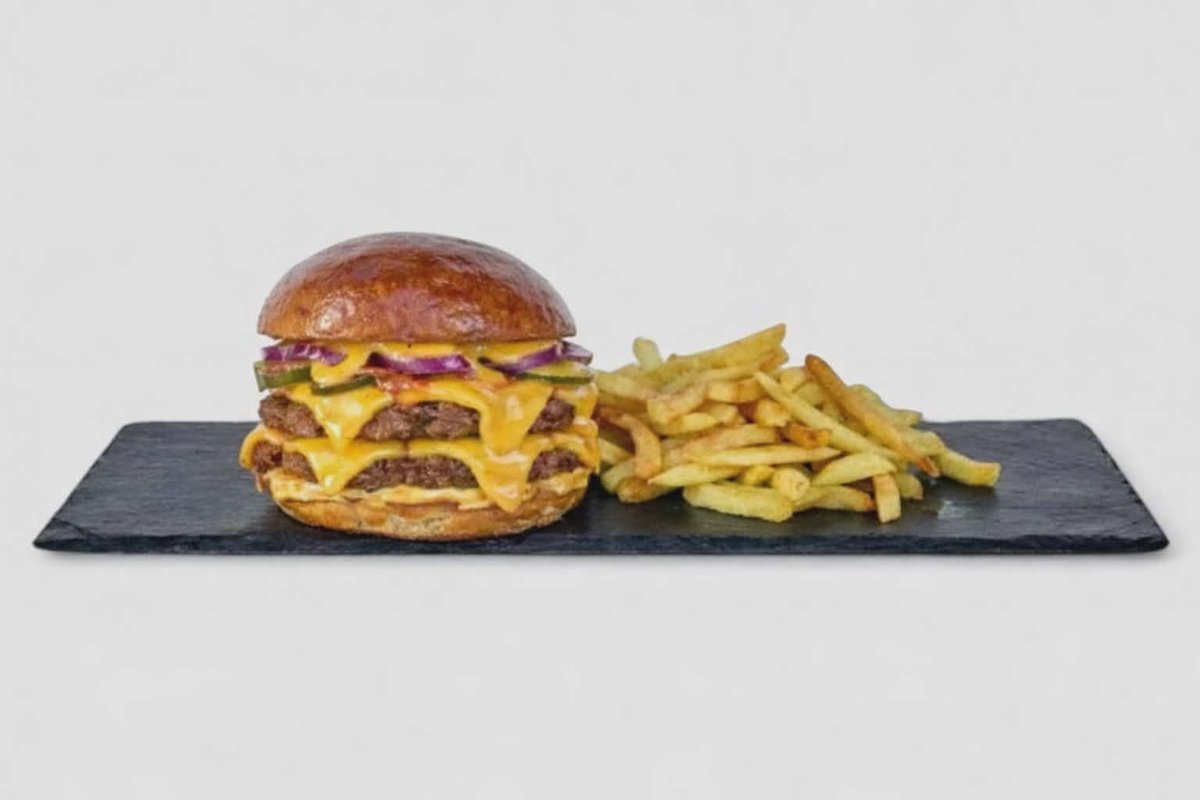 Питка, телешко месо Black Angus, сочен бекон, зрял холандски чедър, млечна моцарела, свежа зеленолистна салата, слайс розов домат, хрупкава кисела краставичка, домашна майонеза, яйце, карамелизиран червен лук-600гр.