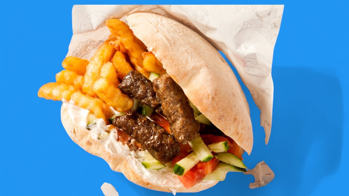 телешки кебапчета-170г, питка-80г, картофи-100г, дзадзики-50г, 1000острова-50г, тиро-50г, домати-30г, краставици-30г, маруля-30г, лук-10г