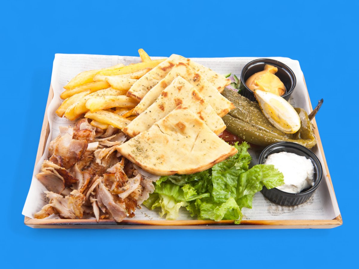 питка-100г, месо-70г, дзадзики-70г картофи-70г, домати-40г, лук-10г, краставици-30г, маруля-10г