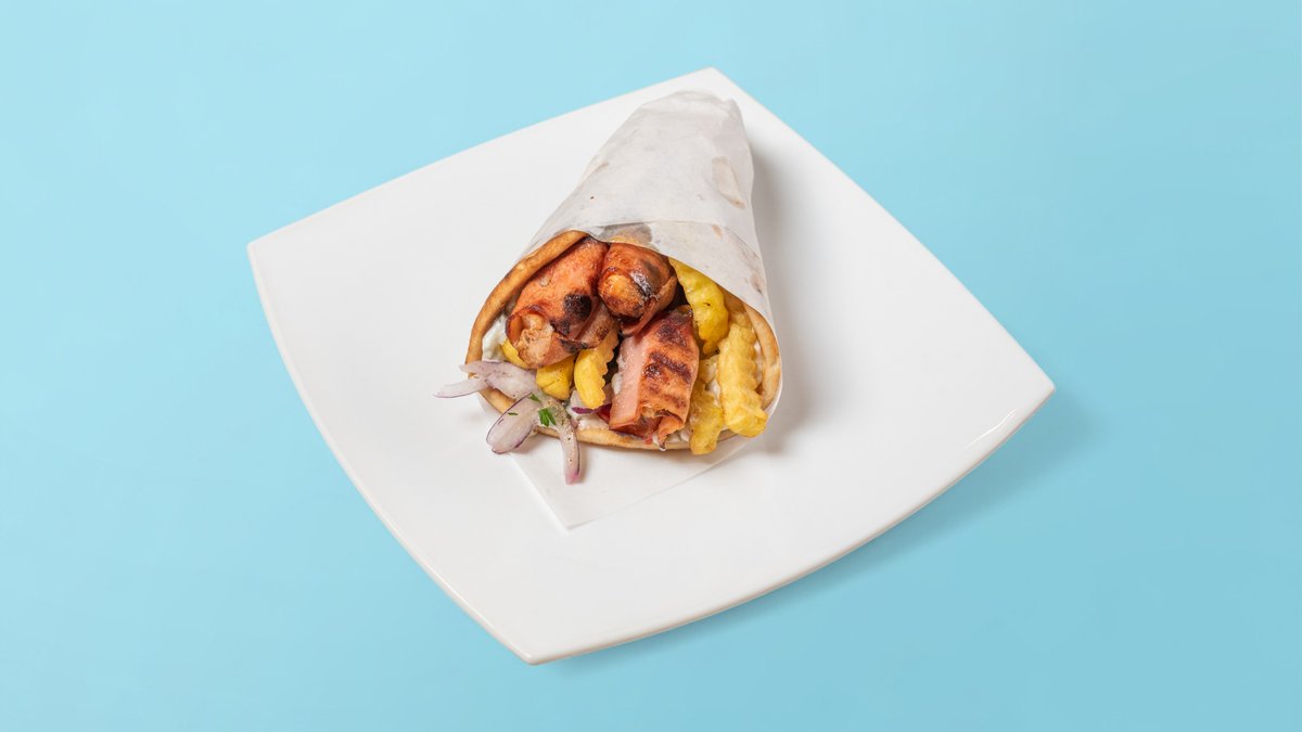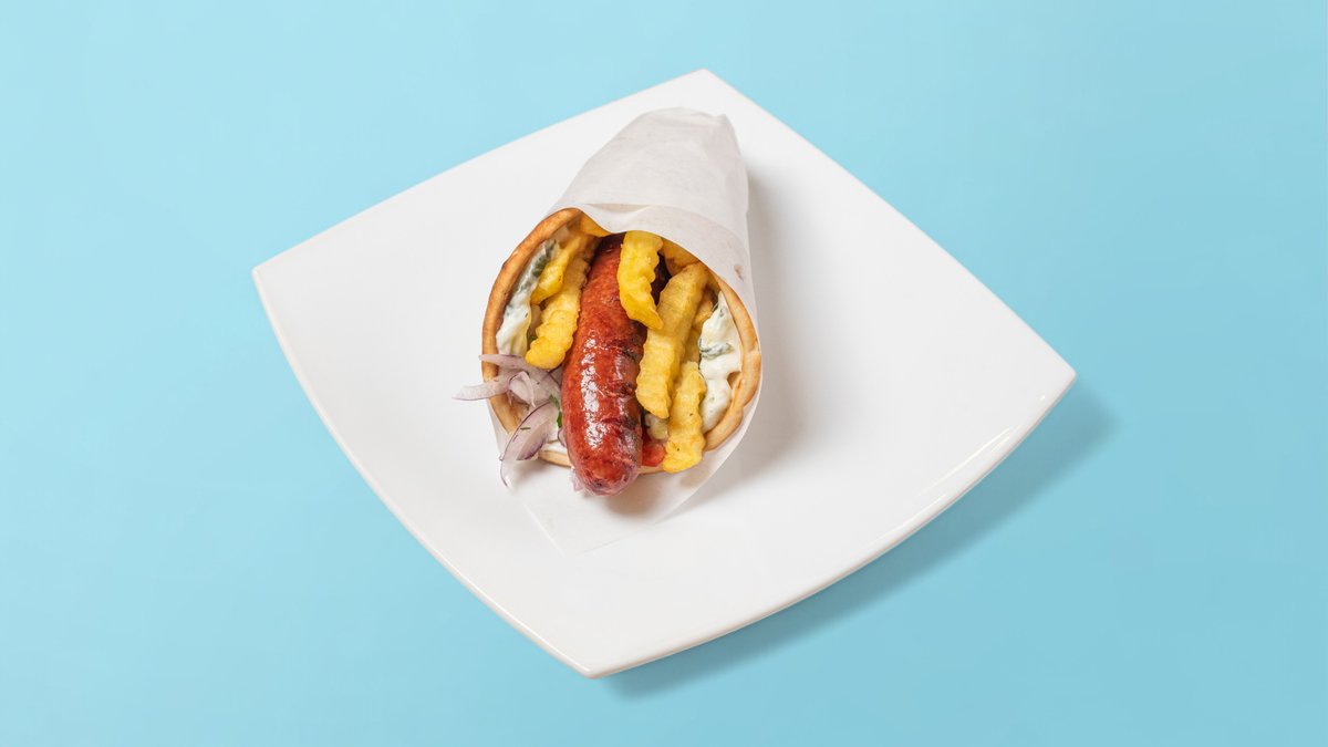 1 брой свинска наденица обвита във вкусна гръцка пита, с избор на салати и сос 320г