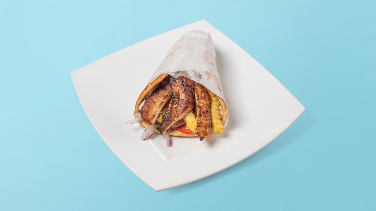 1 брой пилешки шиш от филе обвит с бекон във вкусна гръцка пита, с избор на салати и сос 320г