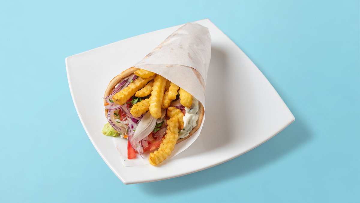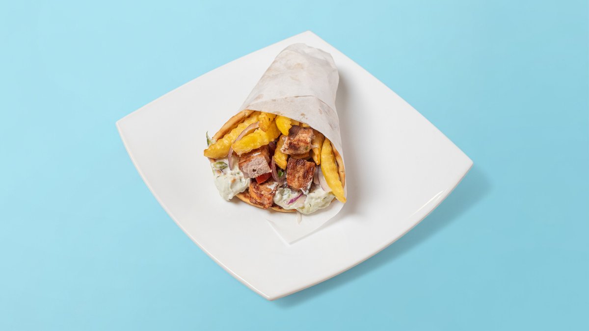 фино нарязано свинско месо обвито във вкусна гръцка пита, с избор на caлати и coс 430г
