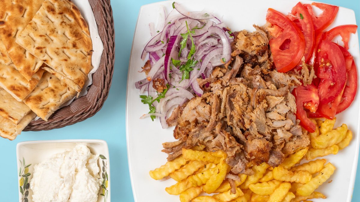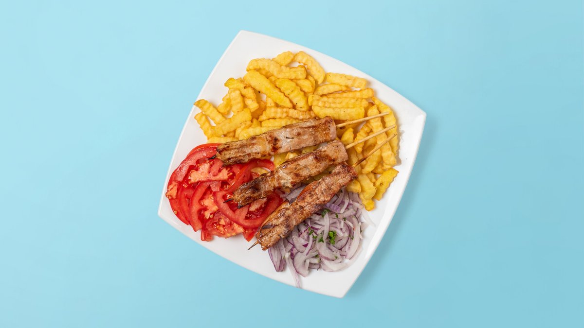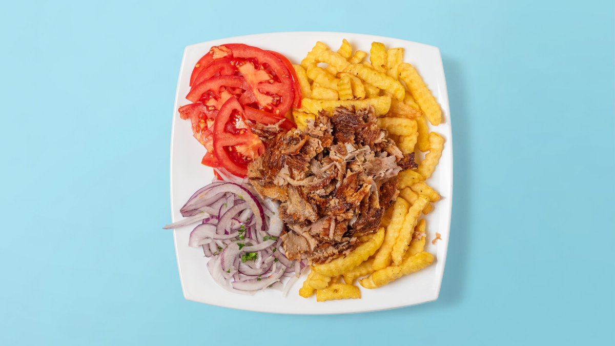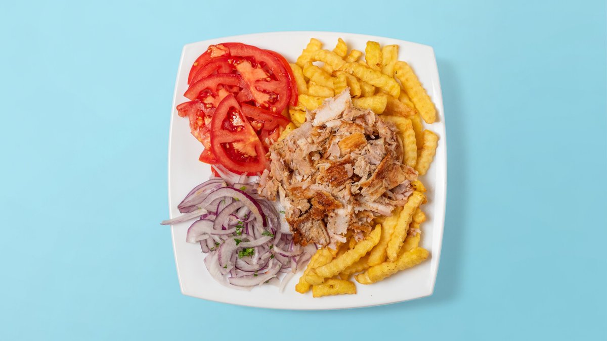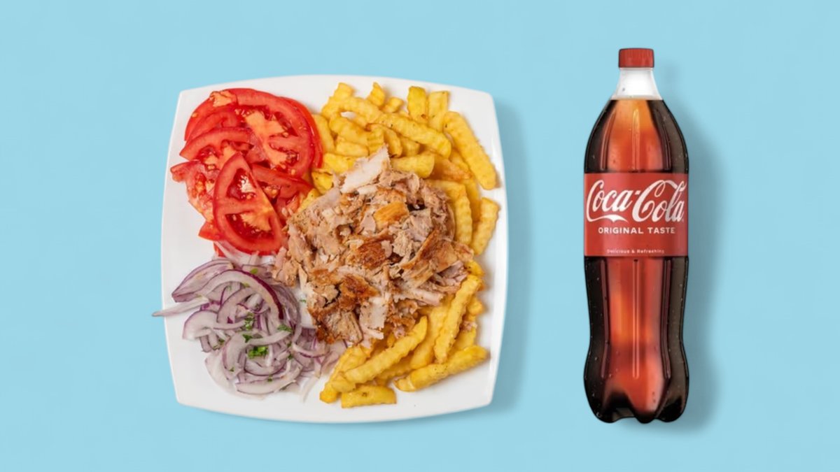 Класическата „Порция Гирос„съдържа фино нарязано пилешко месо с гарнитура от пържени картофи,домати и лук-450г + продукт на Coca-Cola по избор 500мл