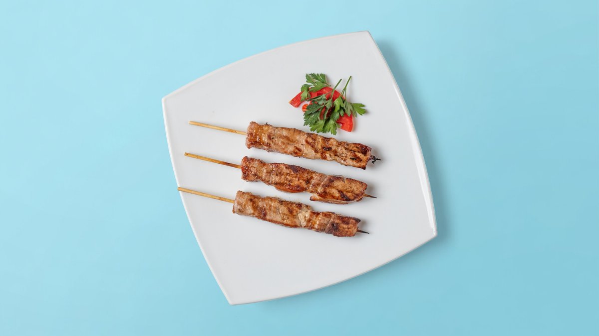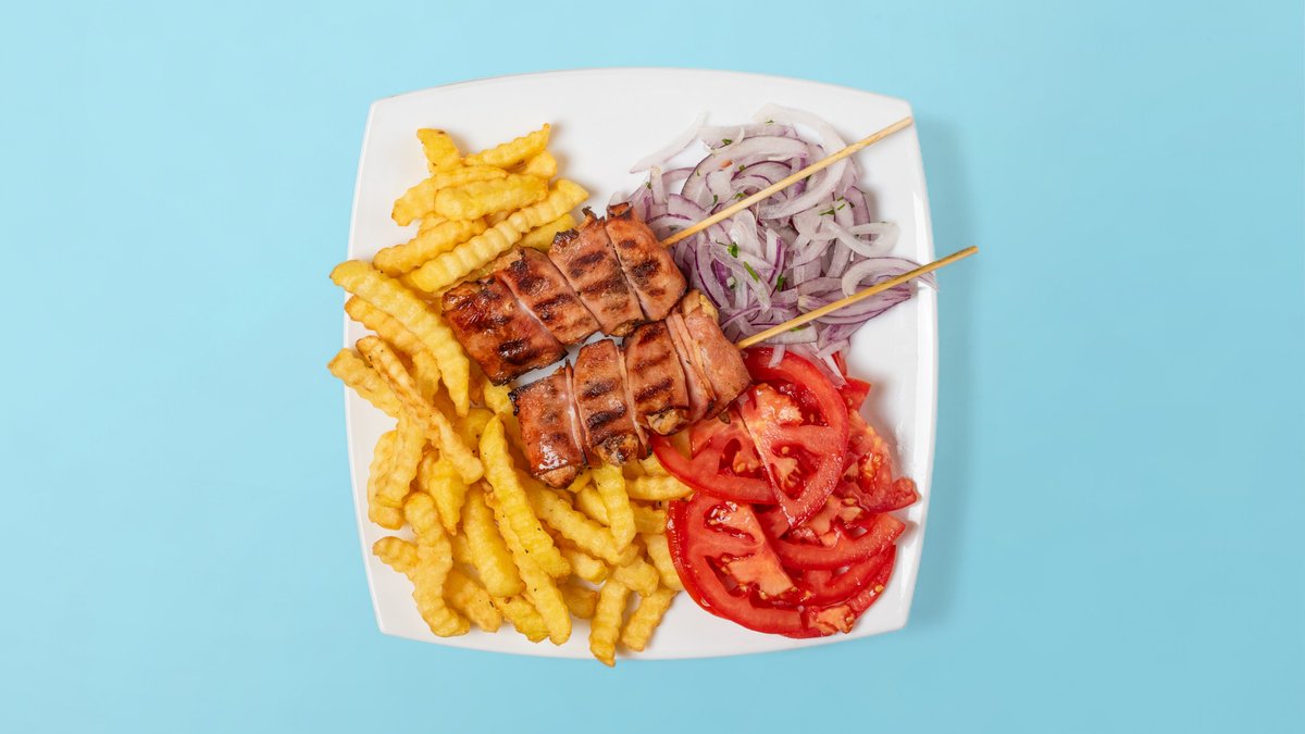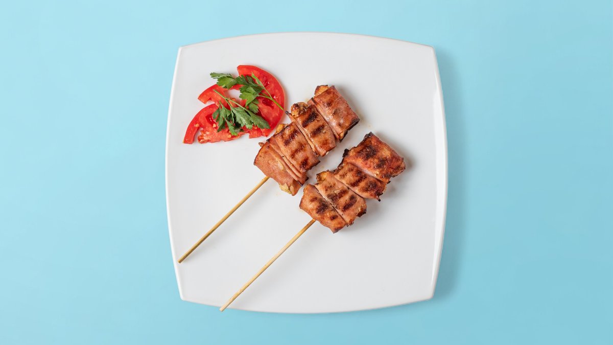 2 броя шишчета от пилешко филе обвито в бекон с гарнитура по избор 450г