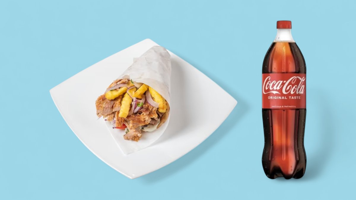 Фино нарязано пилешко месо обвито във вкусна гръцка пита .Класическия Гирос съдържа дзадзики,домати,лук и пържени картофи -430г + продукт на Соса-Cola по избор 500мл