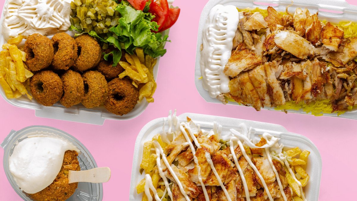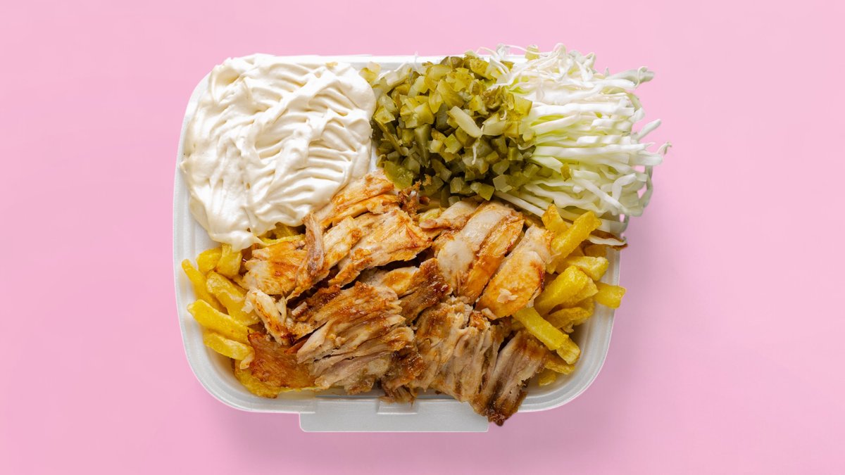 месо от дюнер, чеснова паста, зеле, кисели краставички, пържени картофи и кетчуп 450г