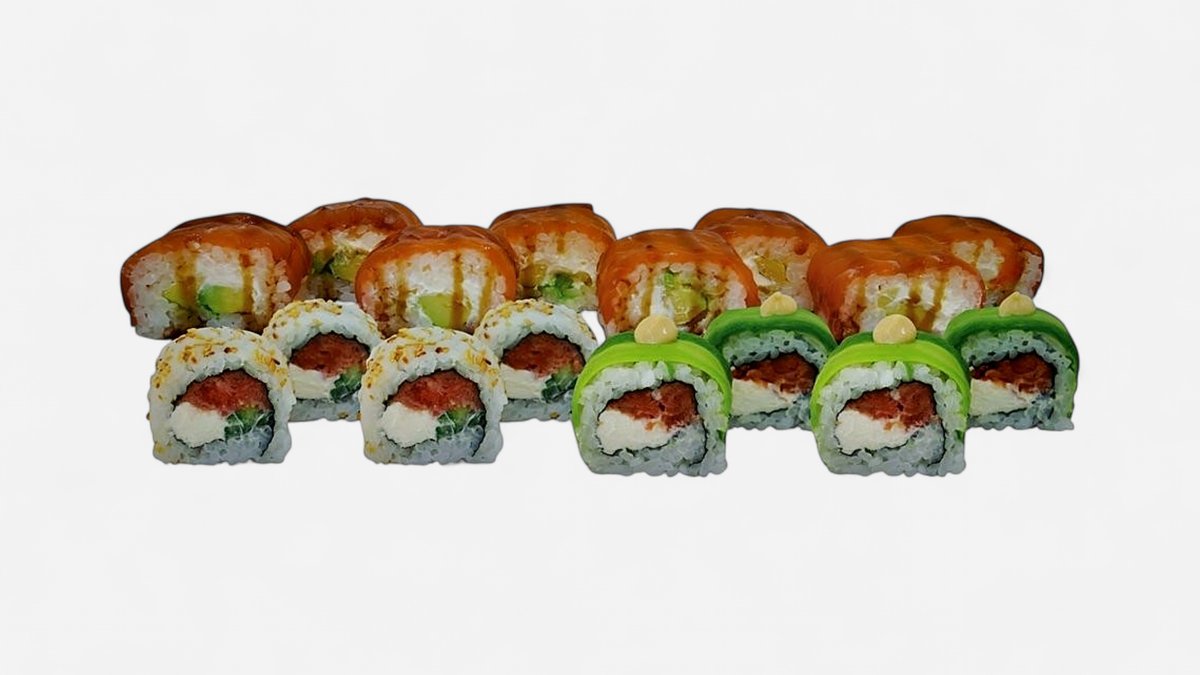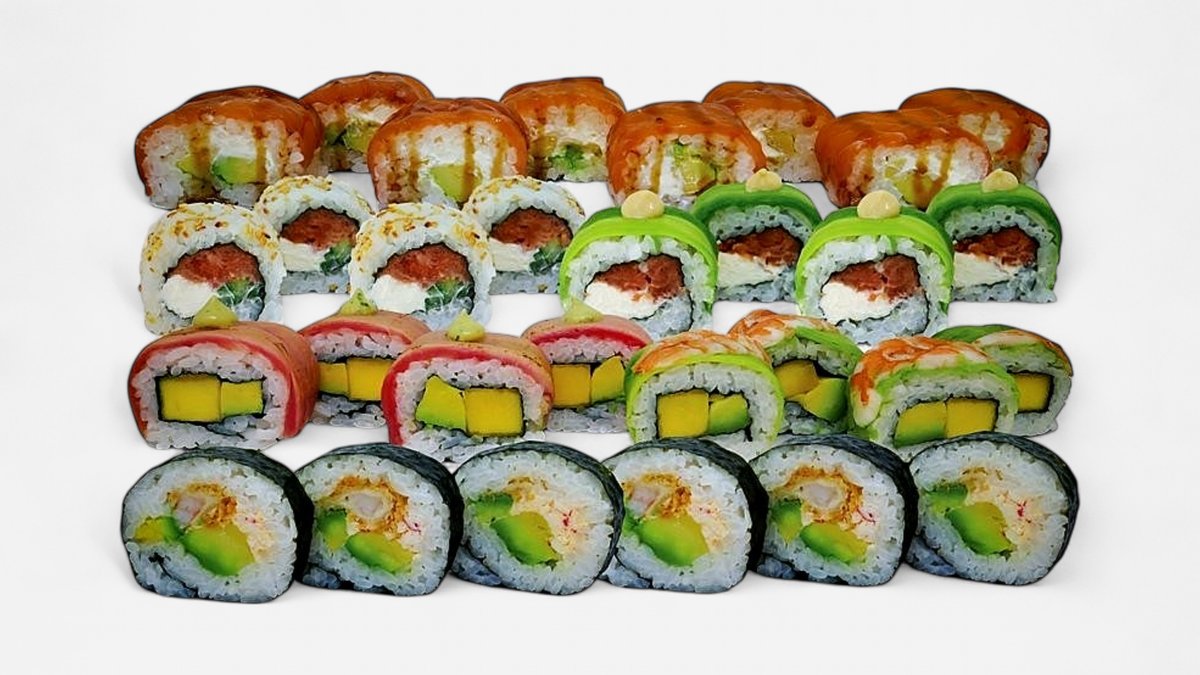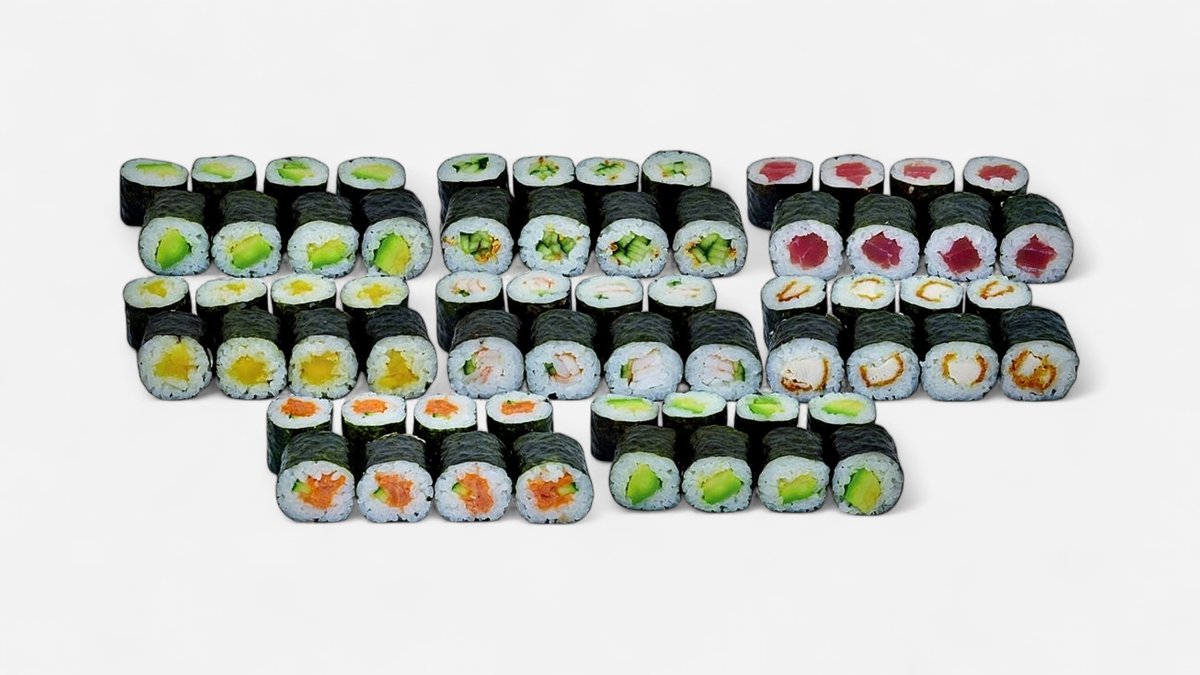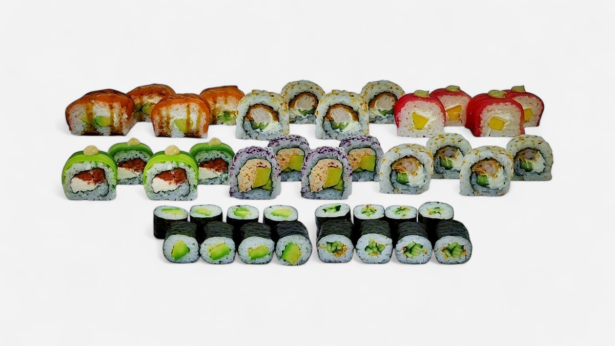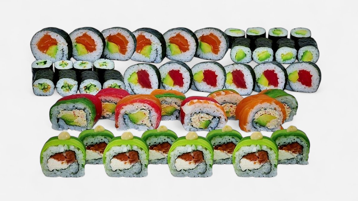 44 броя, 8х хосо Филаделфия краставица, 8х хосо Филаделфия авокадо, 6х футо сьомга, 6х футо тон, 8х рейнбоу рол, 8х гора 1030г