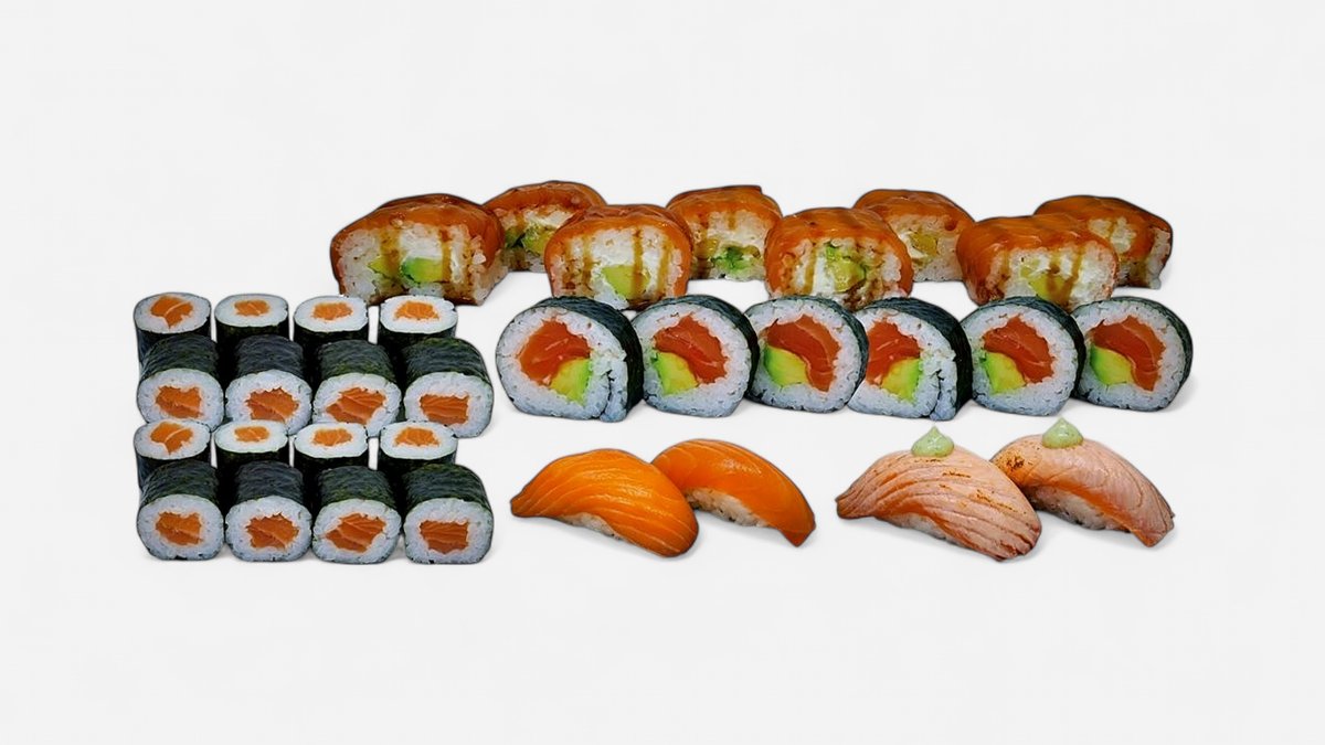 34 броя, 8х хосо сьомга, 8х хосо Филаделфия пушена сьомга, 8х сьомга рол, 6х футо сьомга, 2х нигири сьомга, 2х нигири грилована сьомга 770г