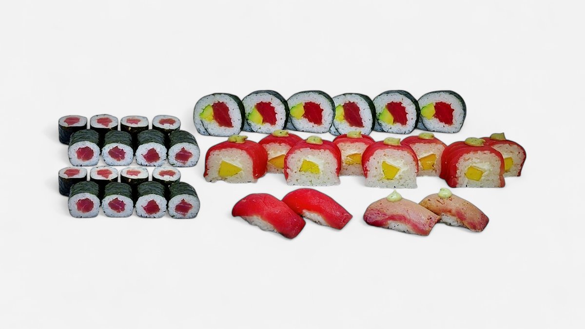 34 броя, 8х хосо тон, 8х хосо Филаделфия тон, 8х магуро рол, 6х футо тон, 2х нигири тон, 2х нигири грилована риба тон 770г