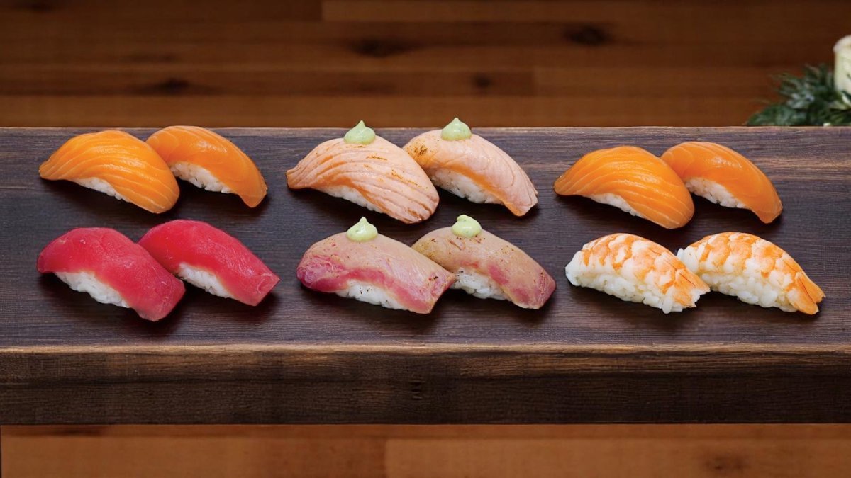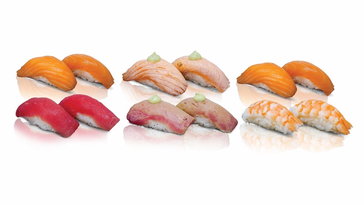 12 броя, 2х нигири сьомга, 2х нигири тон, 2х нигири грилована сьомга, 2х нигири грилована риба тон, 2х нигири скарида, 2х нигири пушена сьомга 420г