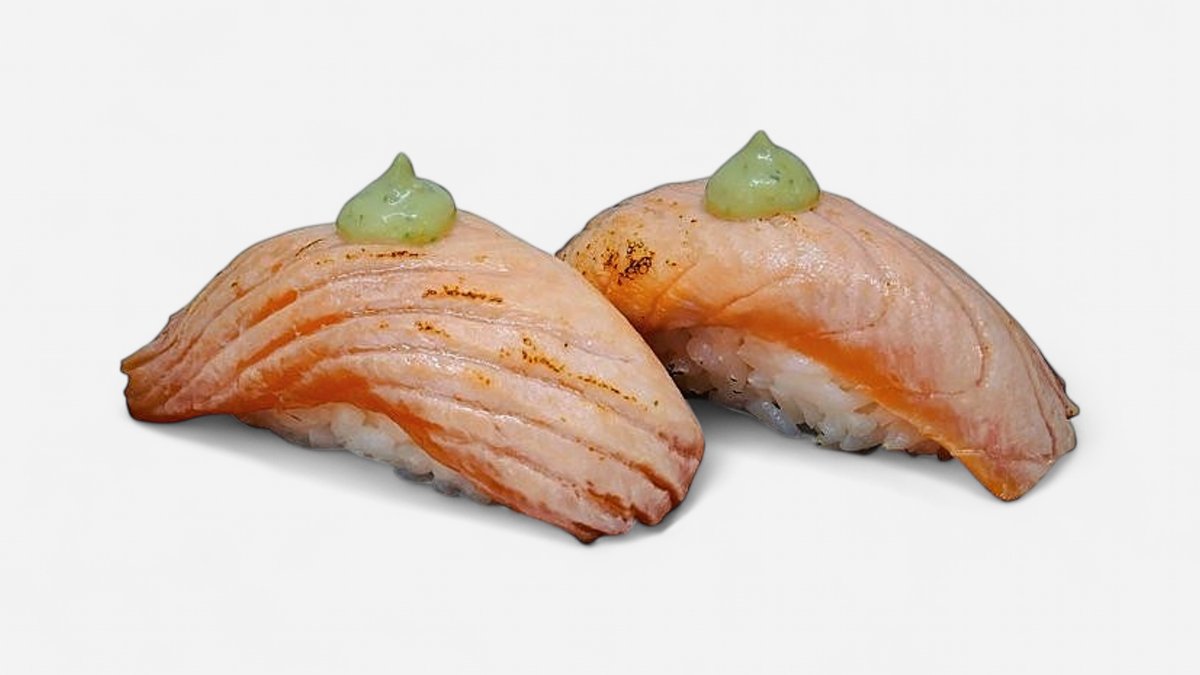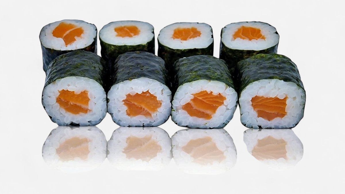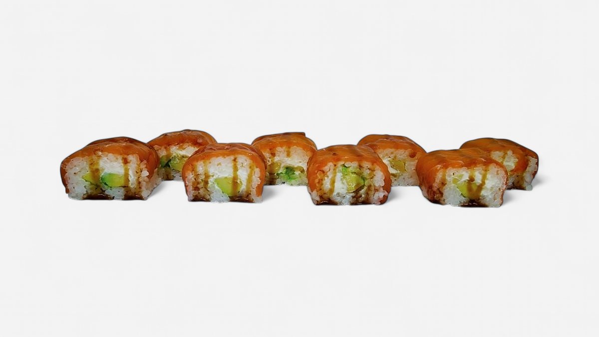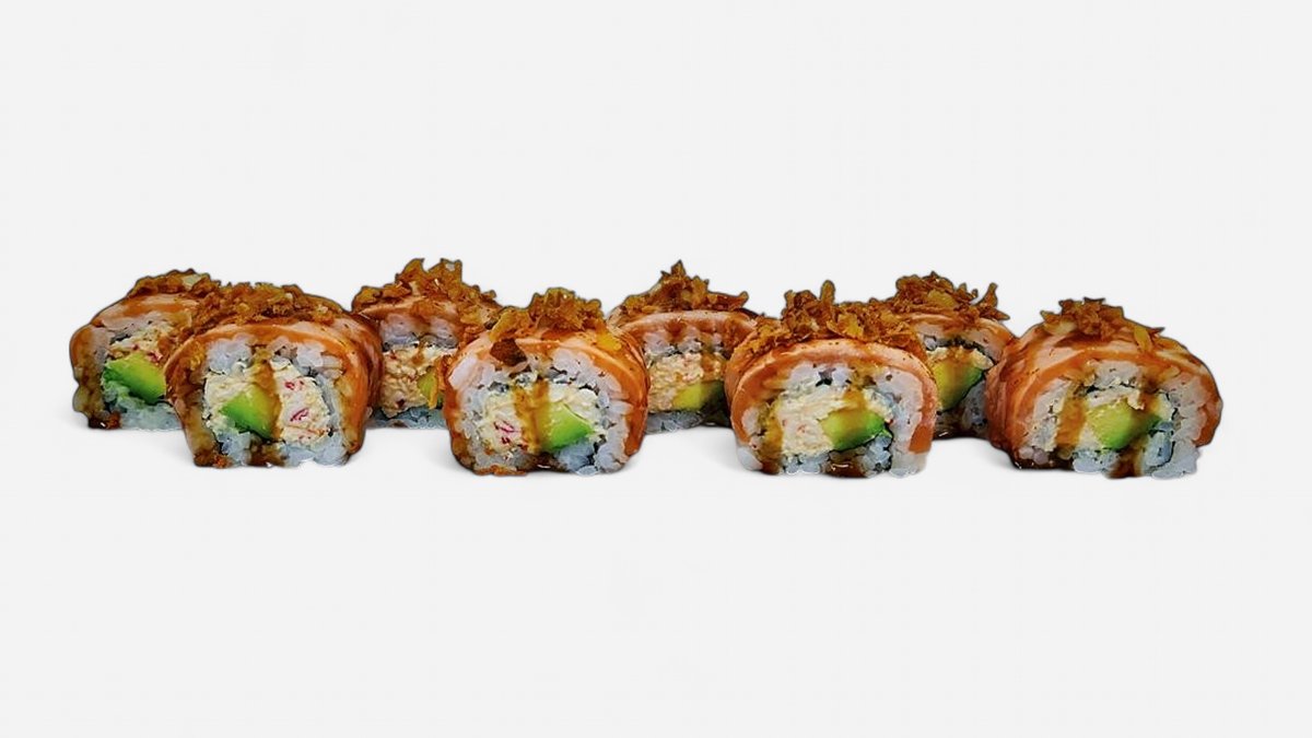 8 броя, грилована сьомга, нори, ориз, крема сирене, мус от раци, авокадо, японска майонеза, унаги сос, пържен лук 240г