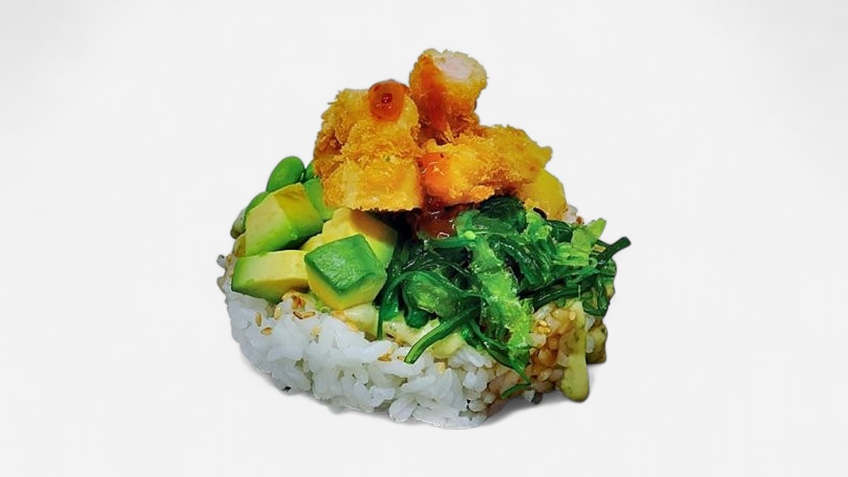 ориз, пилешко месо, авокадо, манго, едамаме, уакаме, сусам, пържен лук, унаги сос, майонеза 320г