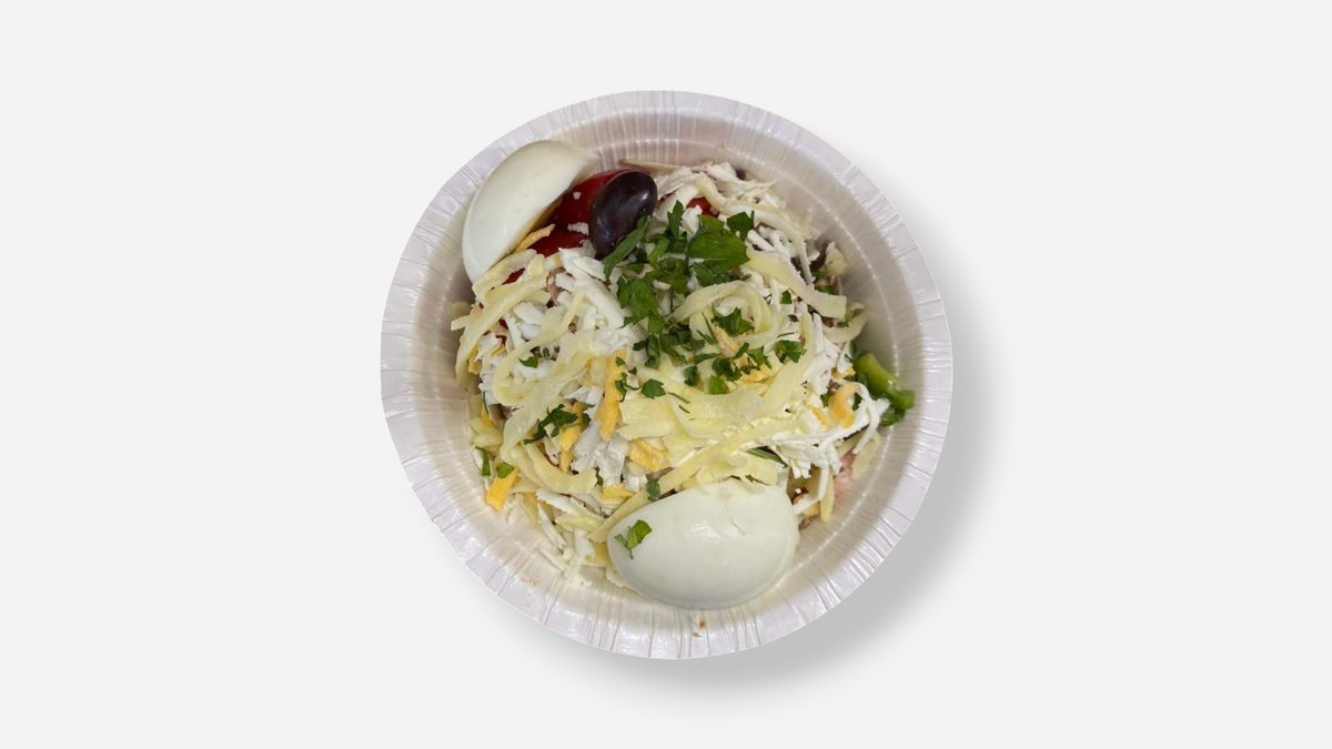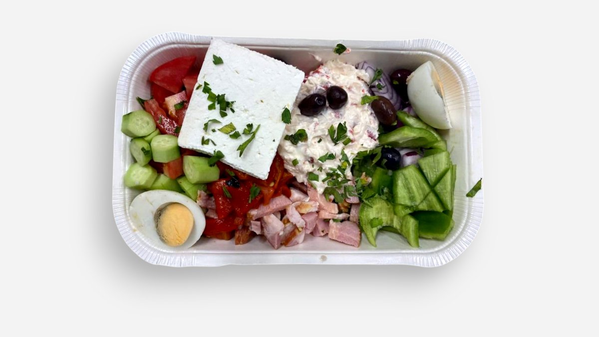 домати, краставици, чушки, шунка, кашкавал, гъби, яйце, сирене, лук, магданоз 350г
