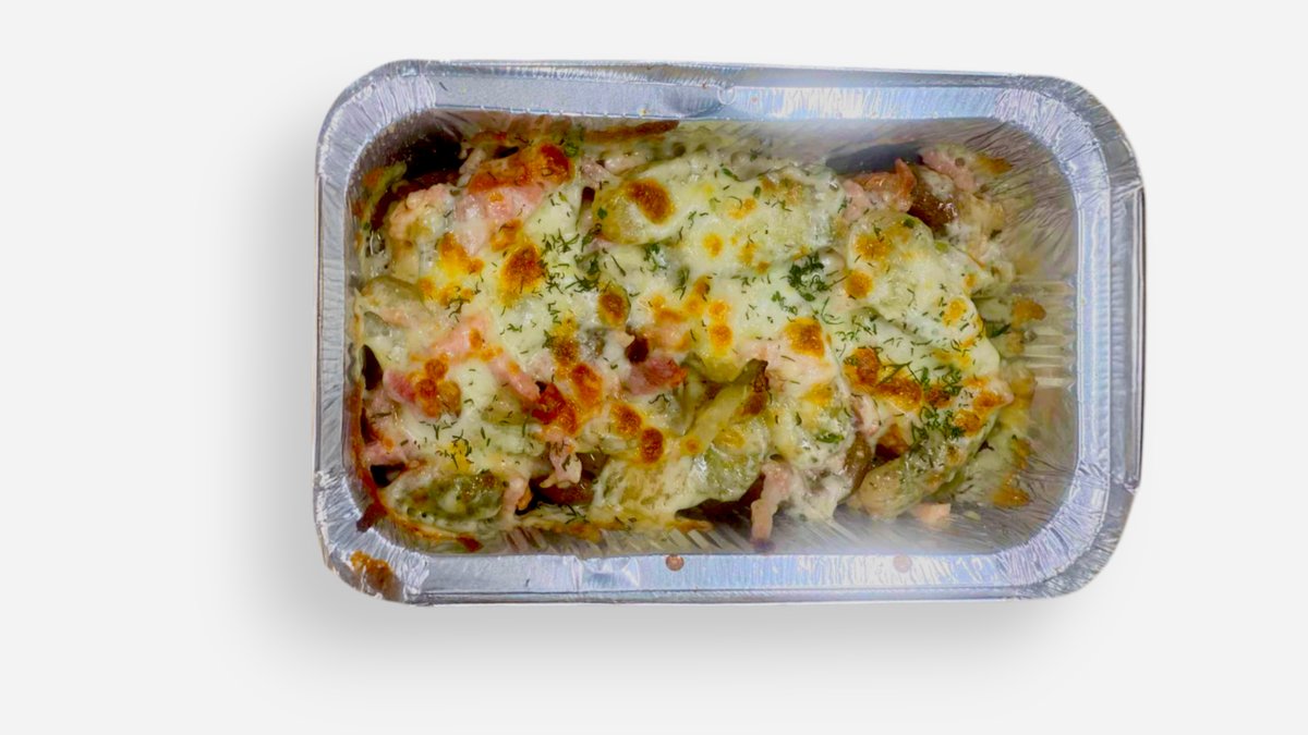 картофи, бекон, сметана, лук, копър, кашкавал 400г