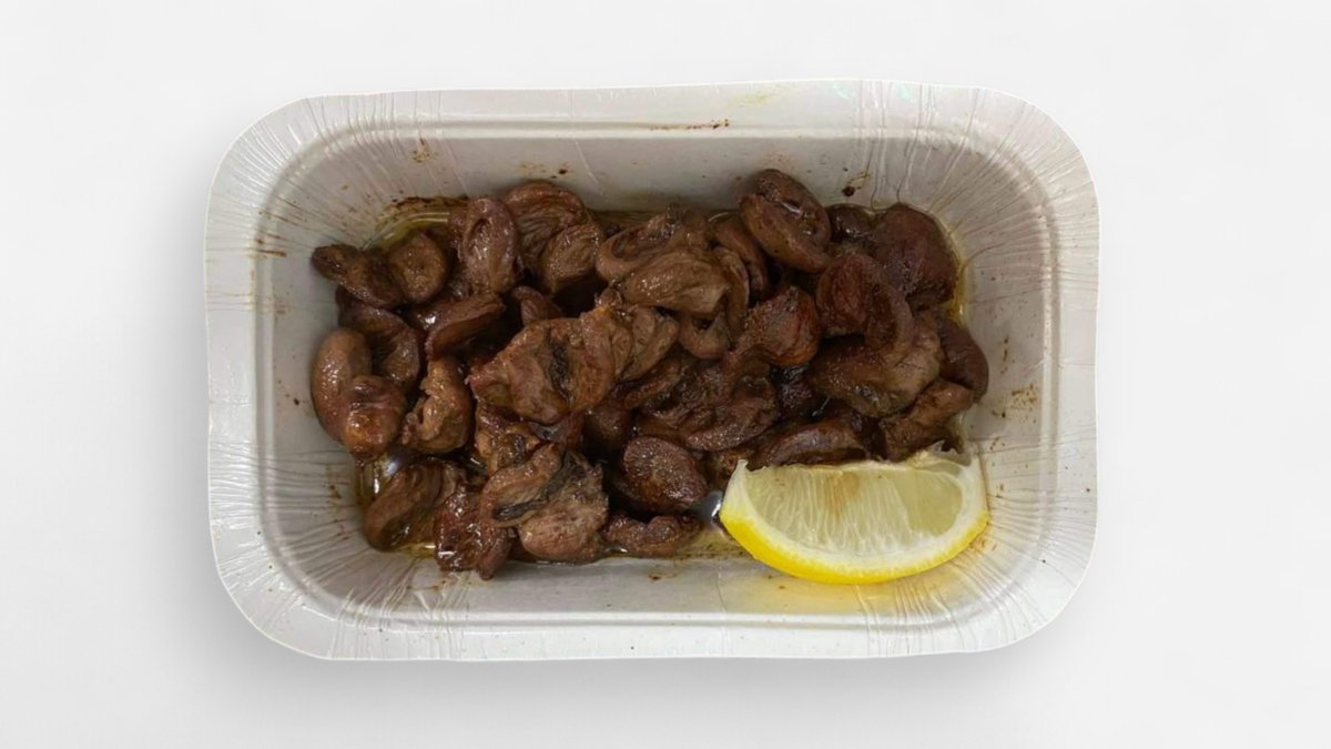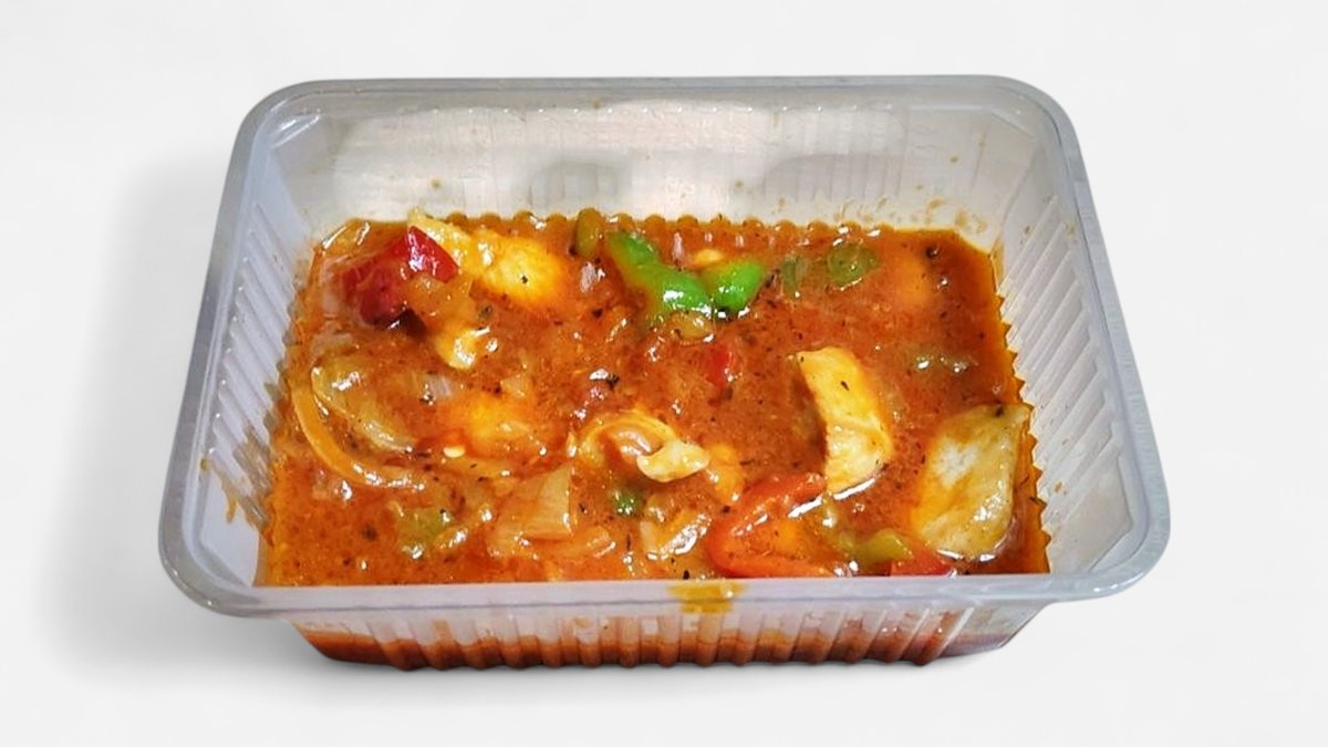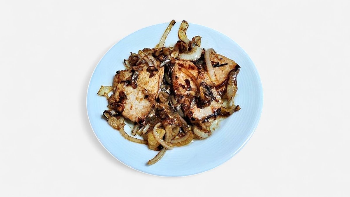 пилешко месо, лук, гъби, чушки, гарнирани със зелева салата и пържени картофи 500г