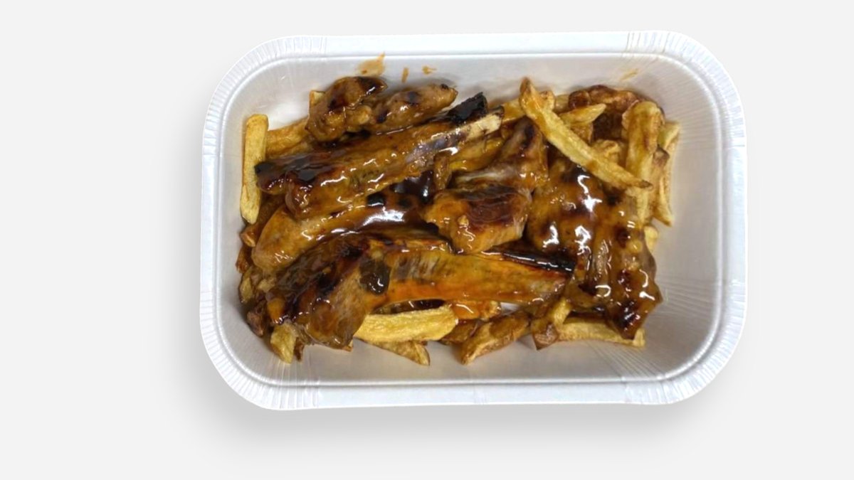 свински врат, лук, гъби, чушки, гарнирани с микс салати и пържени картофи 500г