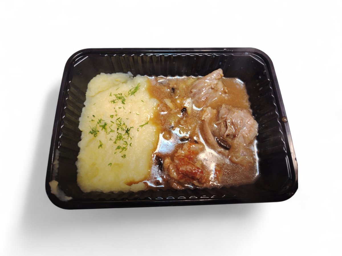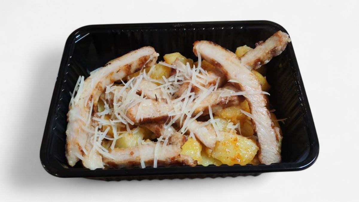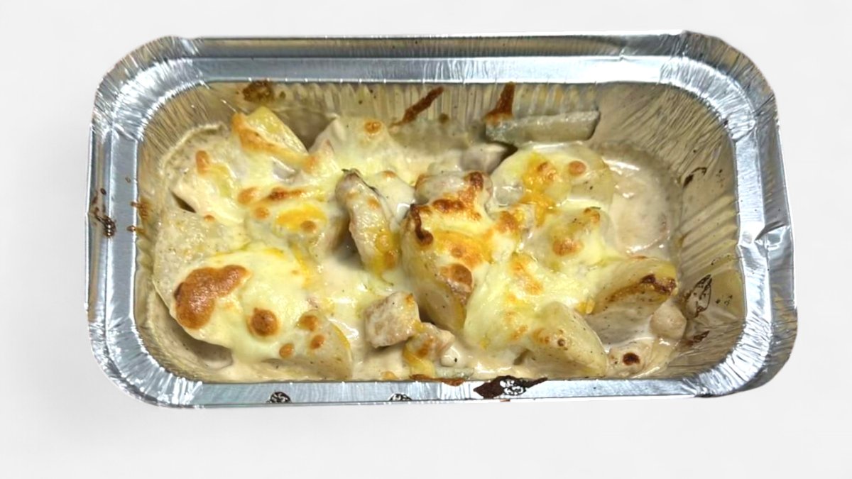 картофи, пилешко филе, гъби, кашкавал, печена чушка, сметана 400г