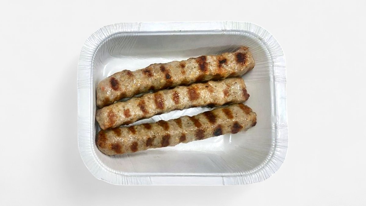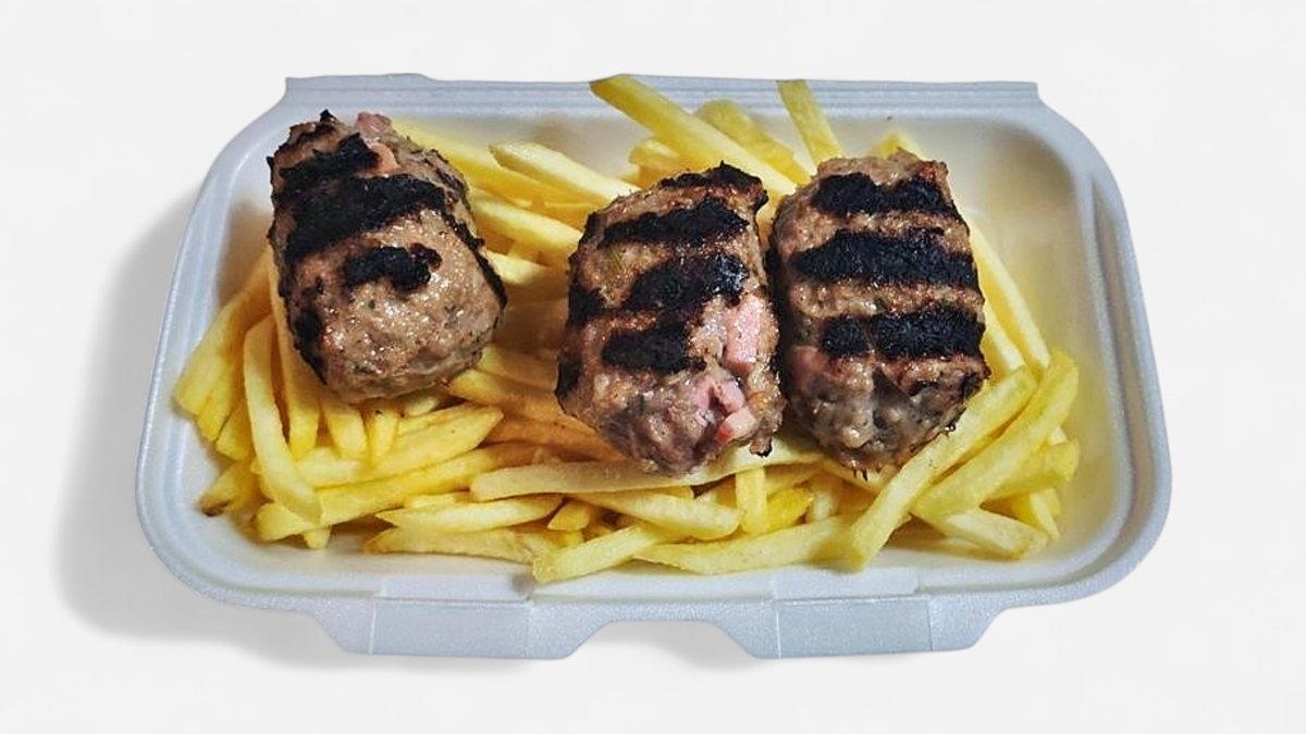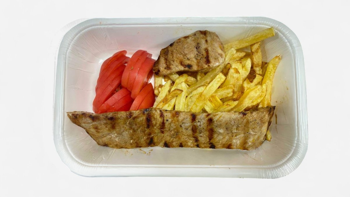 мариновани късчета свинско, пилешко и суров суджук, гарниран с лютеница и пържени картофки 450г