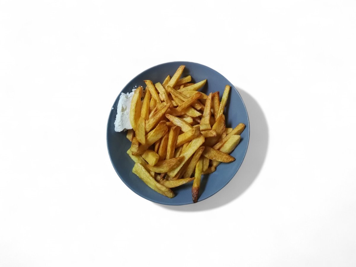 крехко свинско филе с пържени картофи и свежи домати 400г