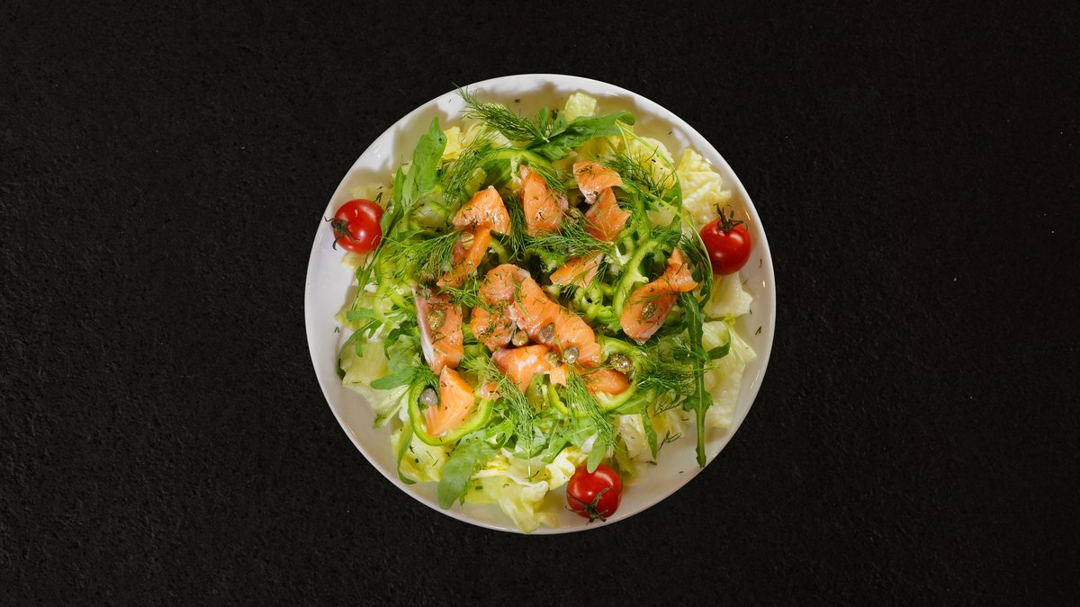 айсберг, сьомга, песто, рукола, чери домати, зелени чушки, каперси, доматен сос, копър, дресинг по ваш избор 340г