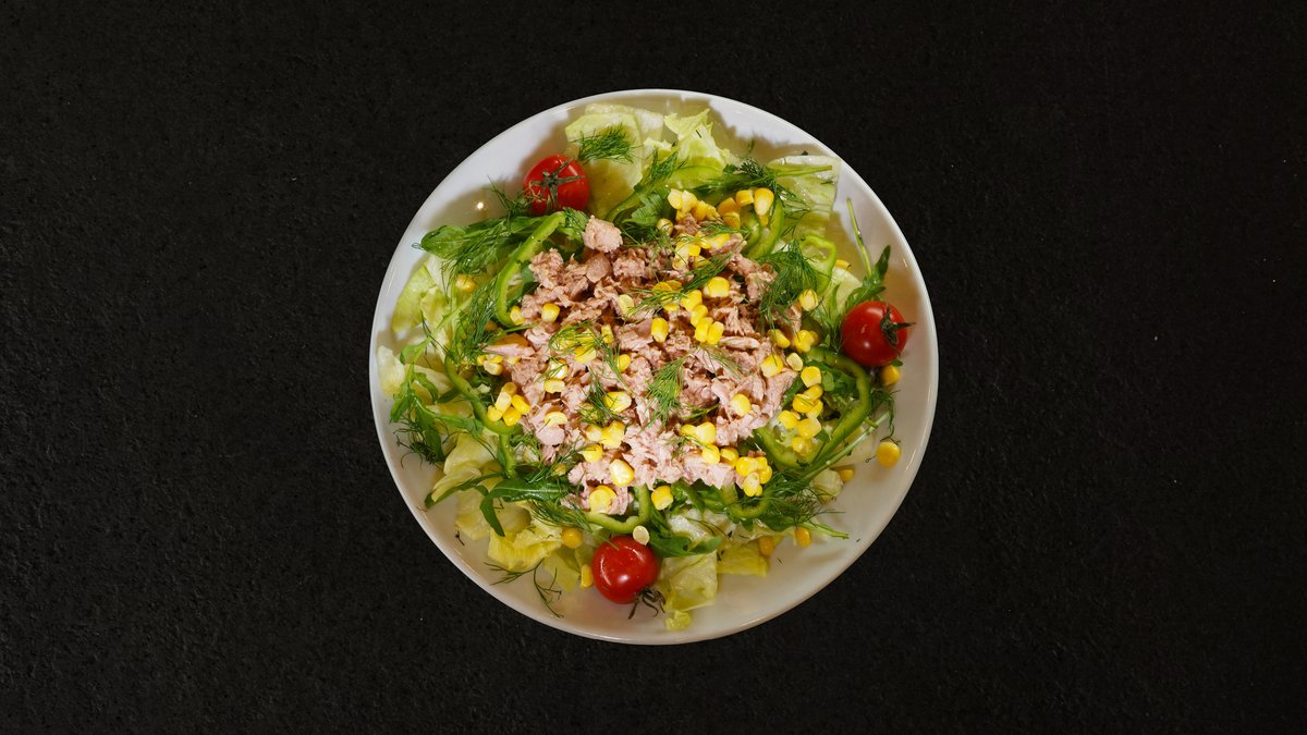 айсберг, рукола, риба тон, царевица, зелени чушки, чери домати, копър, дресинг по ваш избор 390г