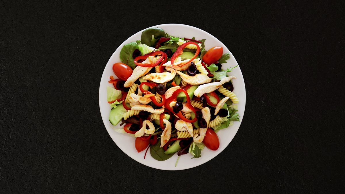 паста фусили, микс салата, краставици, чери домати, пилешко месо, червени чушки, черни маслини, дресинг по ваш избор 410г