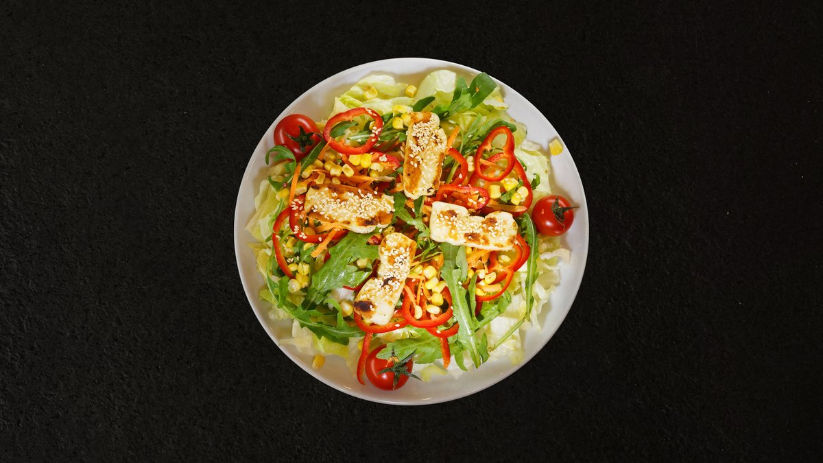 айсберг, рукола, моркови, халуми, червени чушки, чери домати, царевица, сусам, дресинг по ваш избор 425г