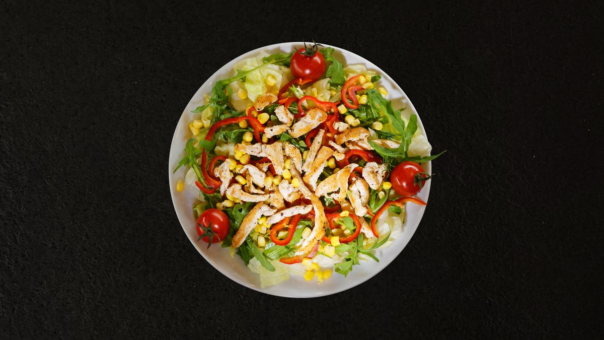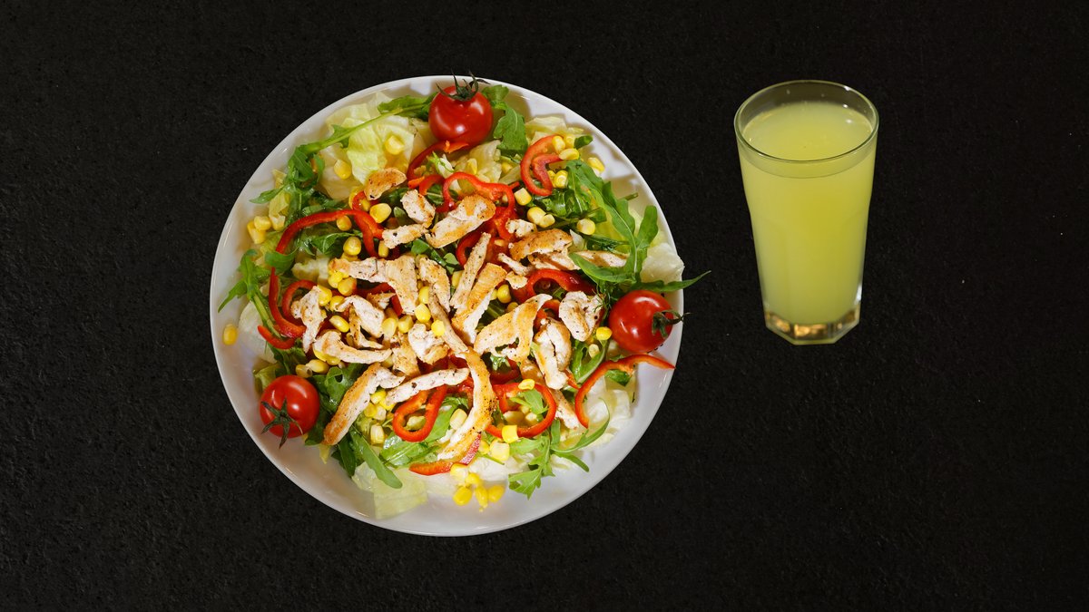 айсберг, мариновано пилешко месо, рукола, царевица, зелени чушки, чери домати, пресни гъби, дресинг по ваш избор 430г