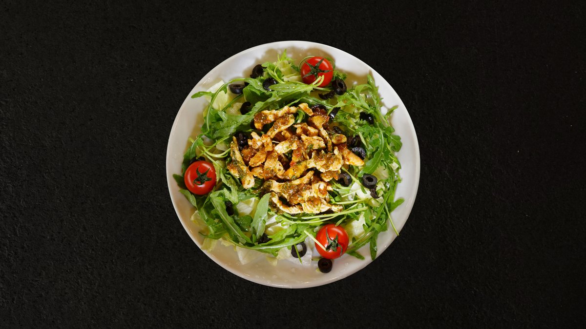 айсберг, пилешко месо на скара, доматен сос, песто, чери домати, черни маслини, рукола, дресинг по ваш избор 390г
