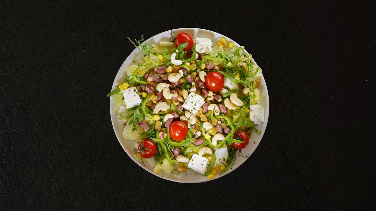 айсберг, рукола, чери домати, фъстъци, стафиди, кашу, царевица, зелени чушки, сирене, дресинг по ваш избор 430г