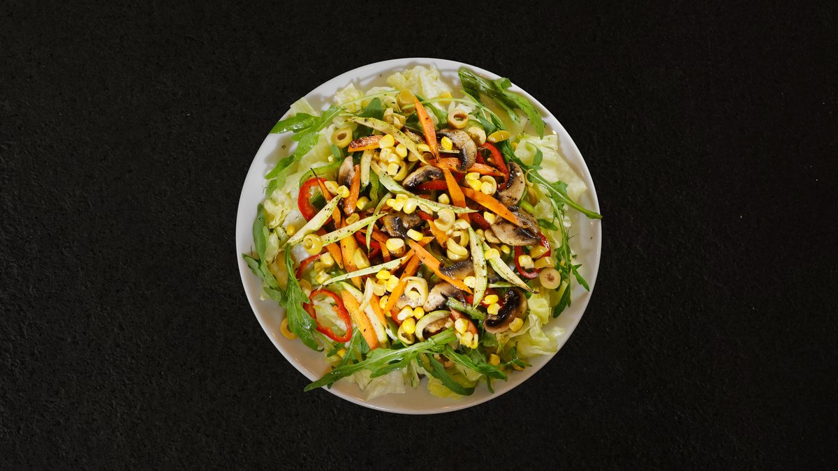 айсберг, рукола, царевица, моркови, тиквички на скара, зелени и червени чушки на скара, пресни гъби на скара, зелени маслини, дресинг по ваш избор 350г