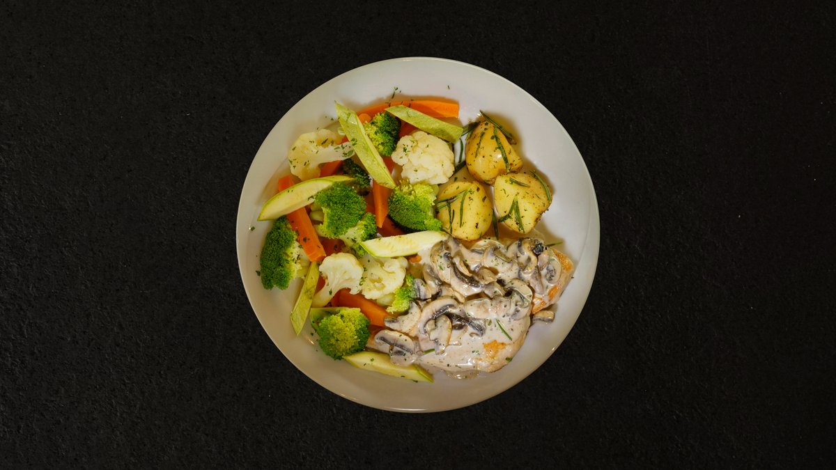 пилешко филе на скара, сос гъби и сметана, гарнирано с варени картофи, задушени броколи, карфиол, моркови, тиквичка и розмарин 410г