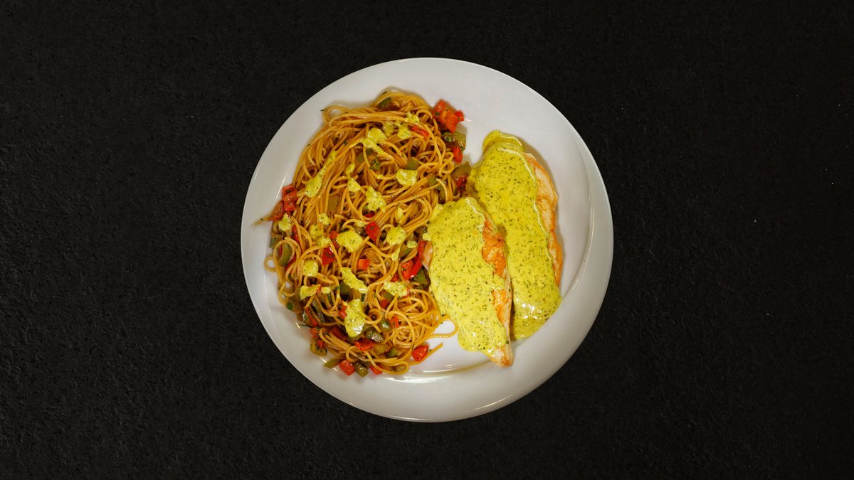 пилешко филе на скара, зеленчуков нудълс, сос кафе де парис 390г