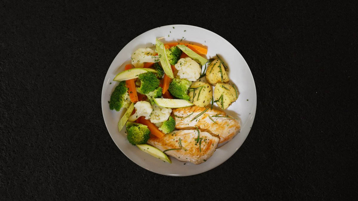 пилешко филе на скара, варени картофи, задушени броколи, карфиол, моркови, тиквичка и розмарин 320г