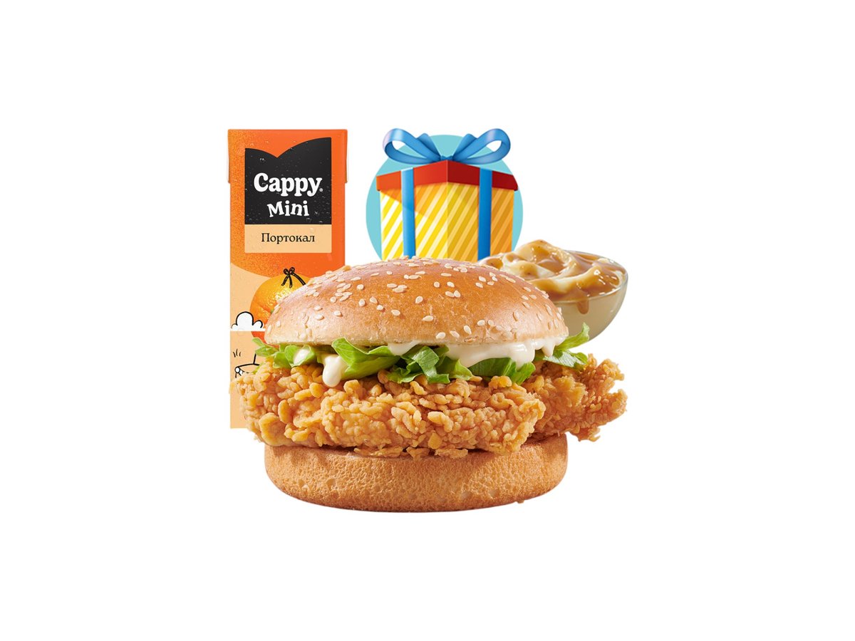 100% сочно истинско пилешко филе по оригинална рецепта, хрупкава салата, лек майонезен сос и хлебче със сусам