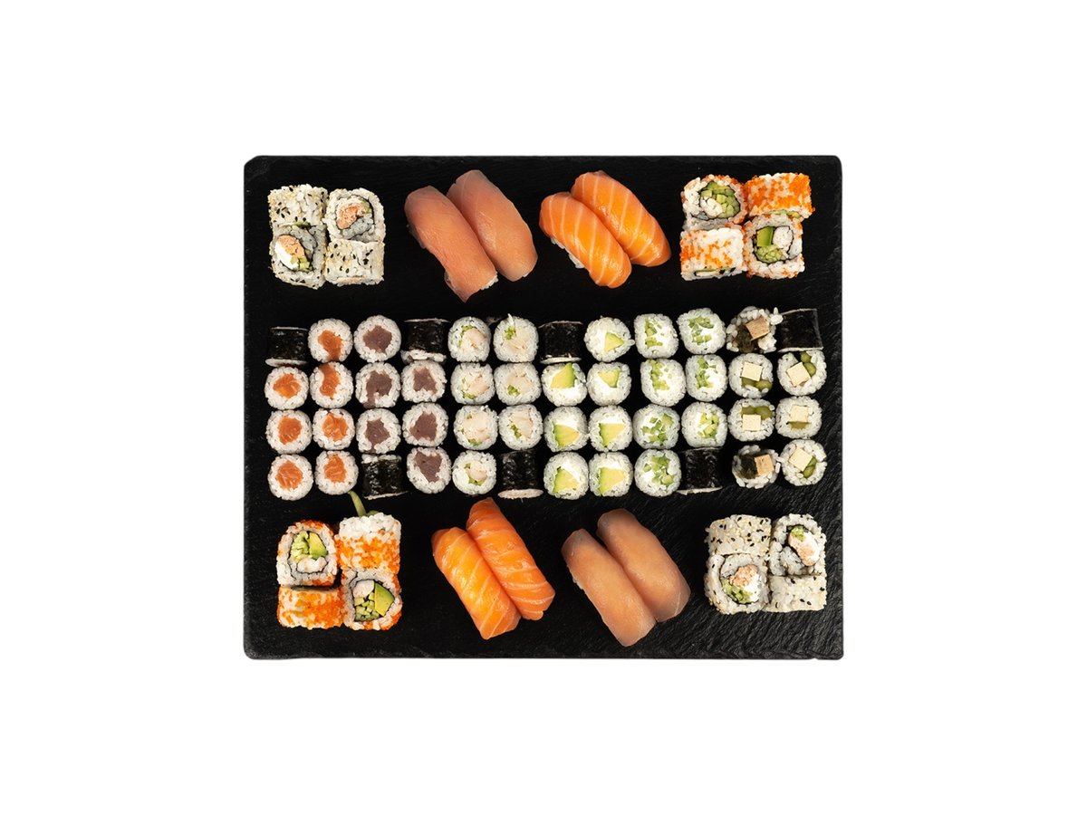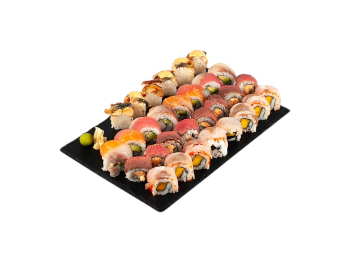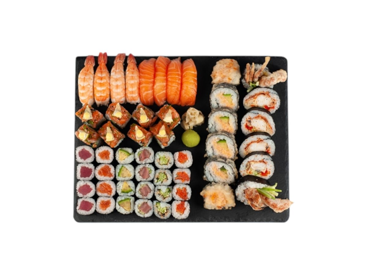 48 броя, нигири сьомга 2х, нигири тон 2х, нигири саба 2х, нигири иваши 2х, тон и скариди 8х, камабоко ролл 8х, печена сьомга ролл 8х, пушена пъстърва ролл 8х, хосомаки камабоко 4х, хосомаки пикантен тон 4х 1280г