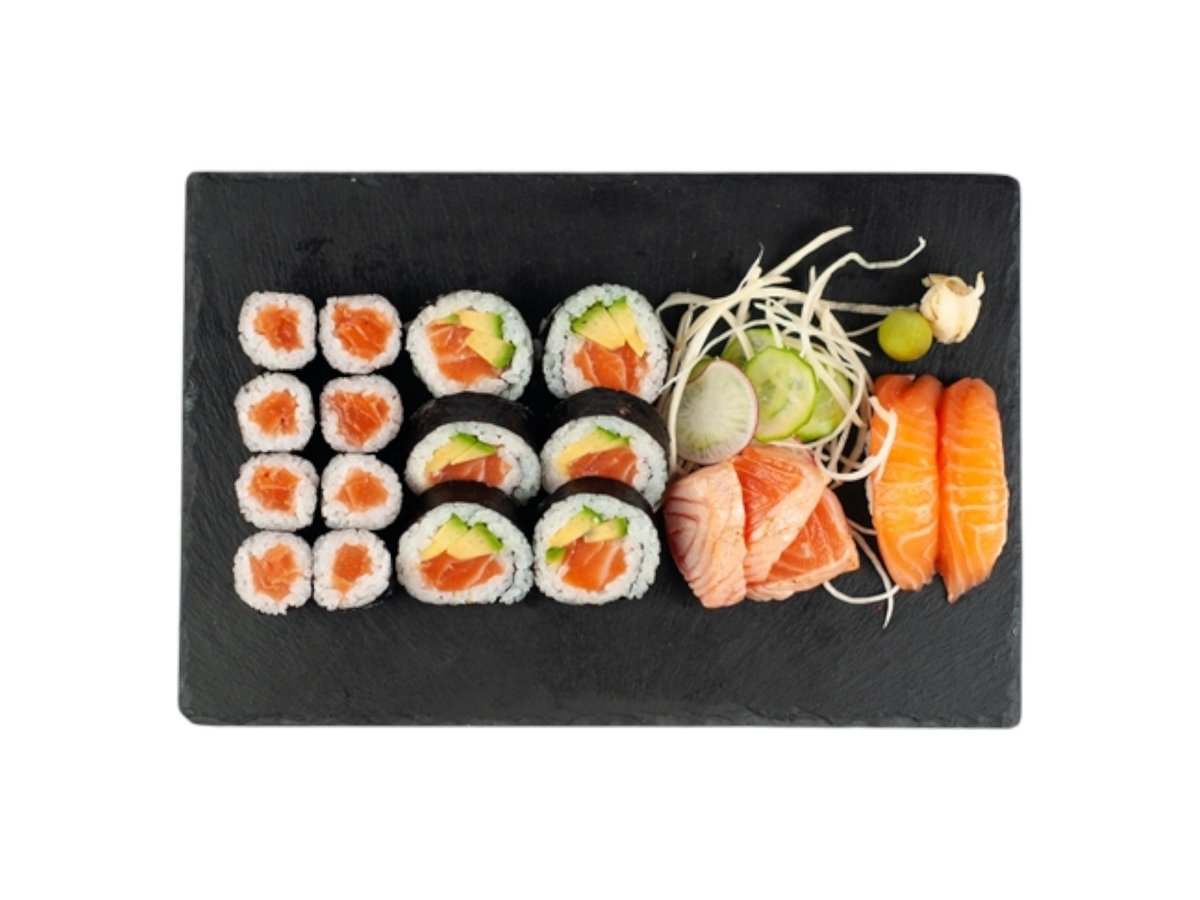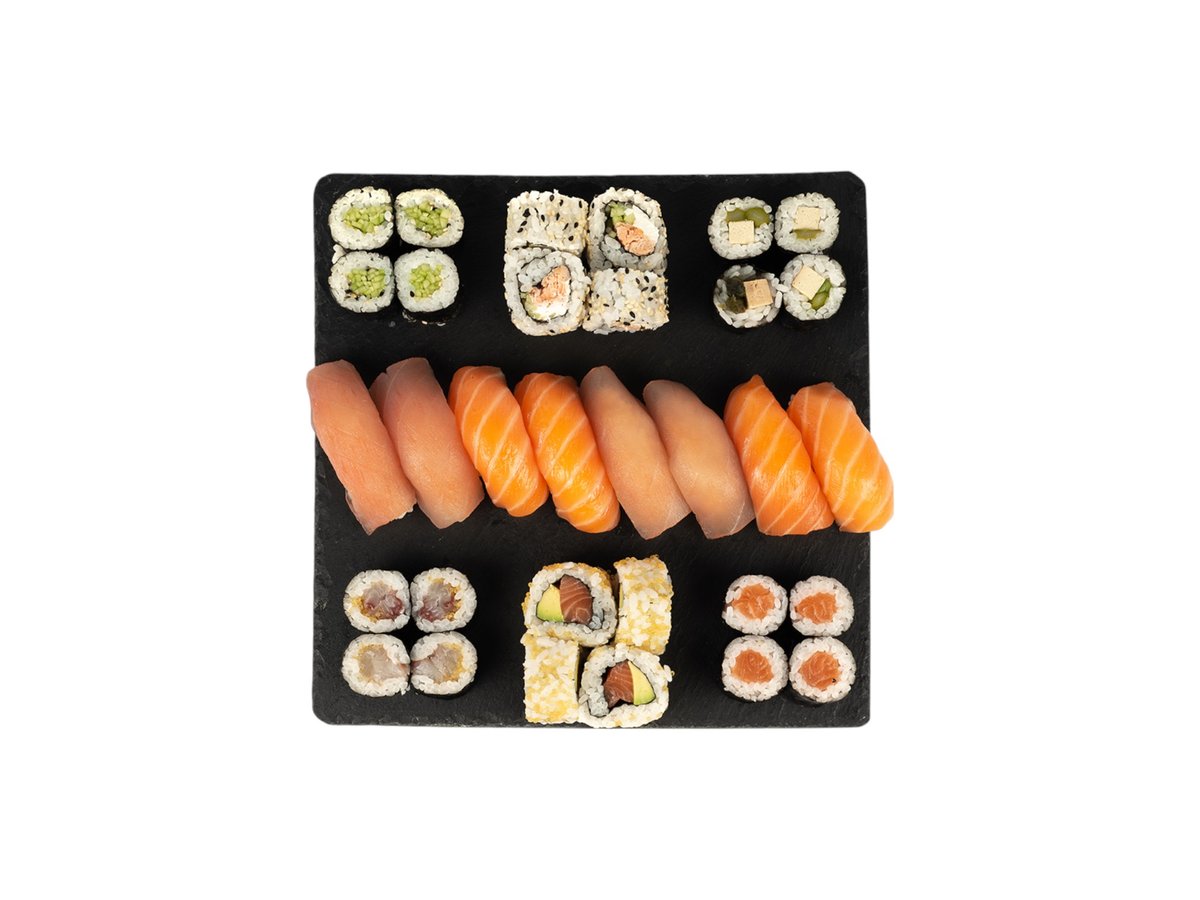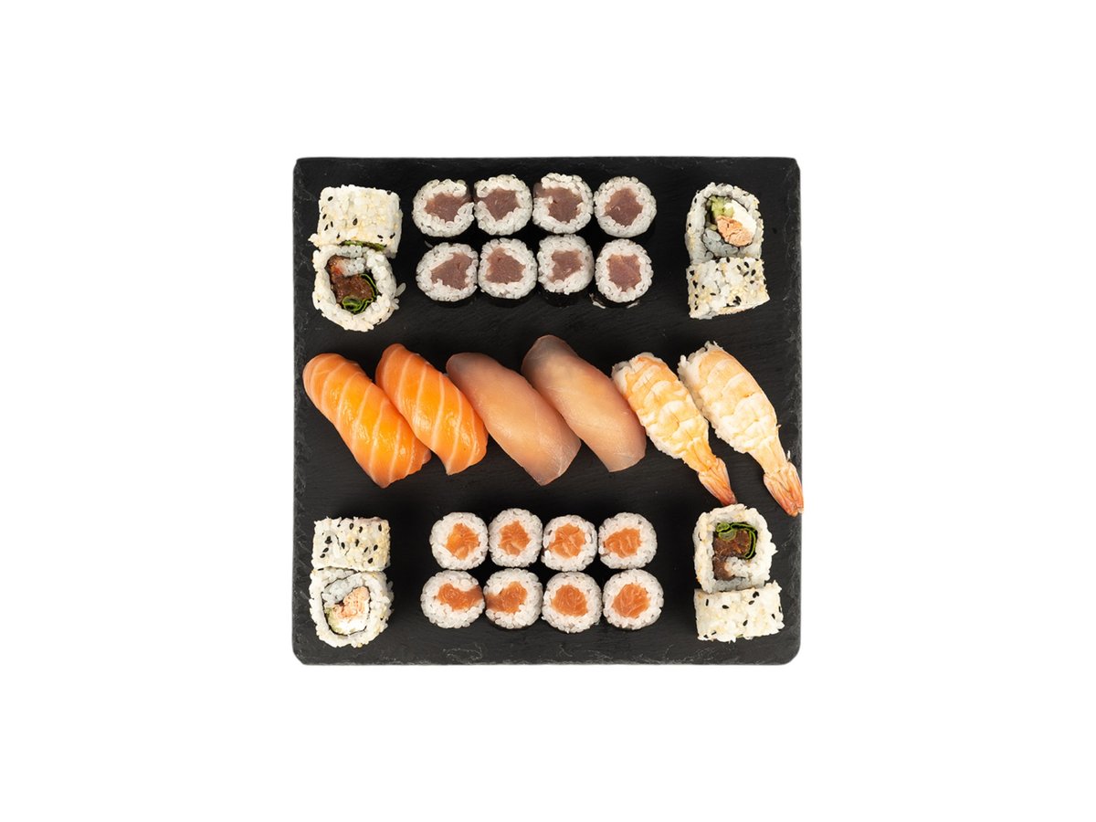 30 броя, хосомаки тон 8х, хосомаки сьомга 8х, урамаки Филаделфия 4х, урамаки пикантен тон 4х, нигири тон 2х, нигири сьомга 2х, нигири скариди 2х (2 броя клечки, 2x 20г джинджифил, 1x 20г уасаби, 2x 20мл соев сос Kikkoman Less Salt) 650г