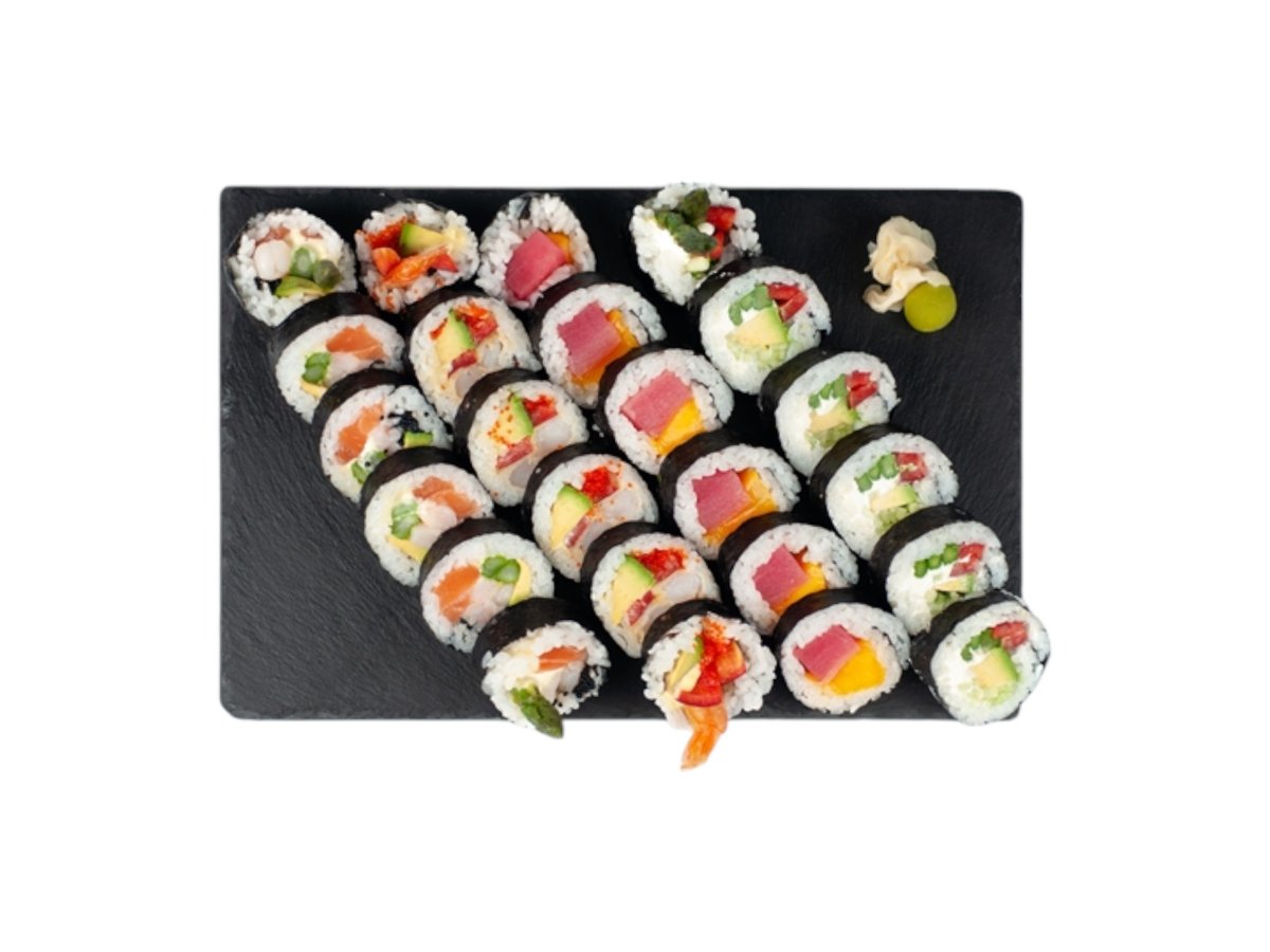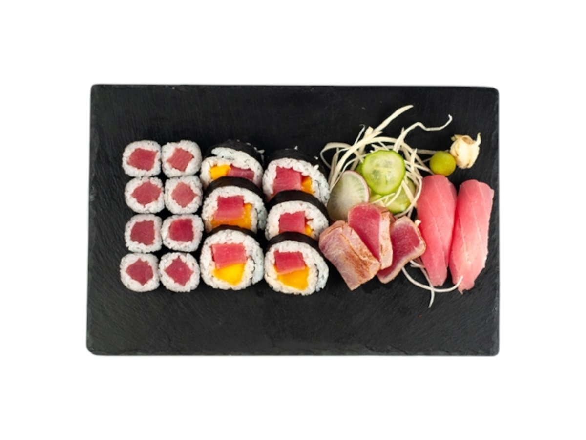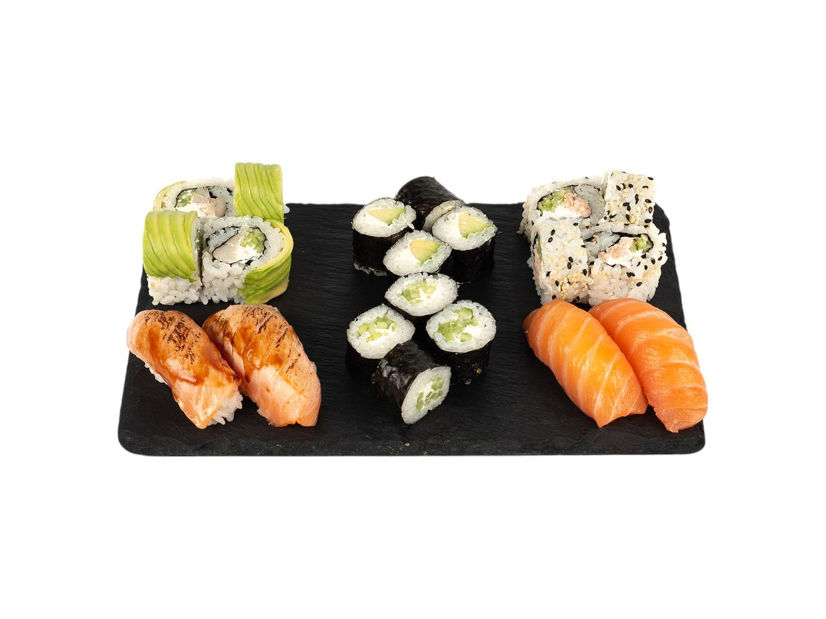 30 броя, хосомаки тон 8х, хосомаки сьомга 8х, урамаки Филаделфия 4х, урамаки пикантен тон 4х, нигири тон 2х, нигири сьомга 2х, нигири скариди 2х (2 броя клечки, 2x 20г джинджифил, 1x 20г уасаби, 2x 20мл соев сос Kikkoman Less Salt) 650г