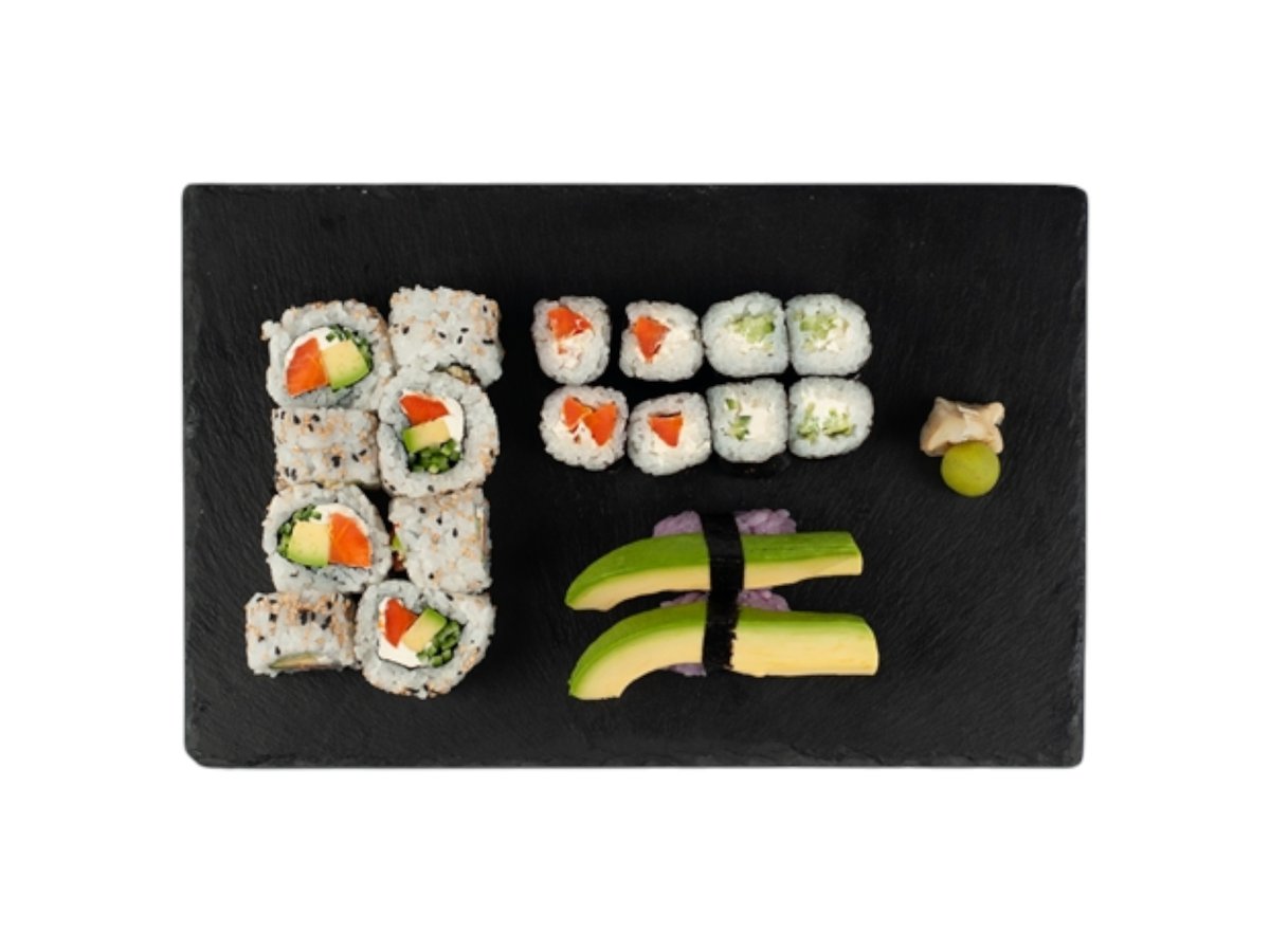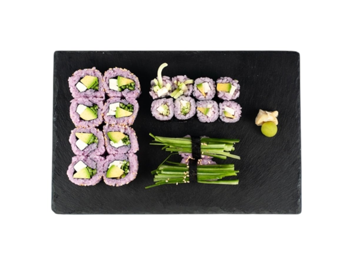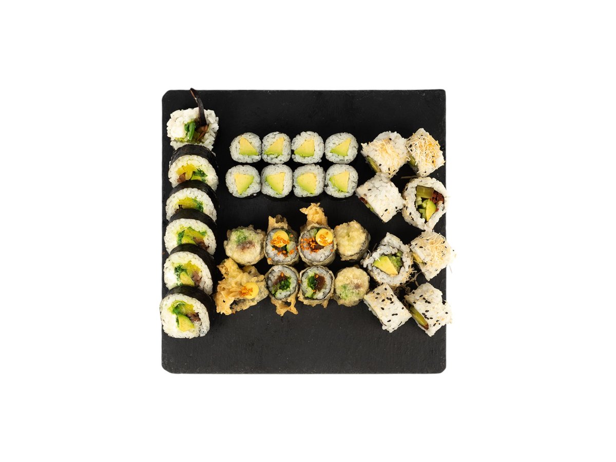 30 броя, футомаки веге 6х, хосомаки авокадо 8х, хосомаки хокайдо 8х, урамаки веге 4х, урамаки азия 4х (комплекта включва: 2 броя клечки за суши, 2x 20г джинджифил, 1x 20г уасаби, 2x 20мл соев сос Kikkoman Less Salt) 600г
